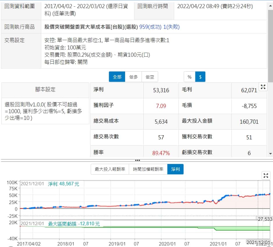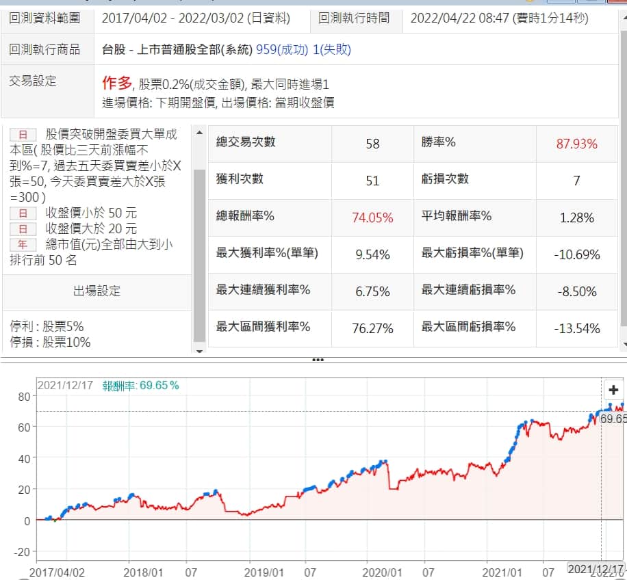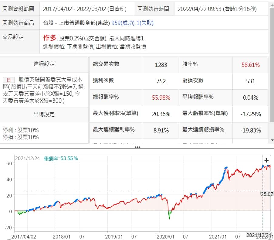 看到有人拿XQ雲端策略中心的策略來優化,手癢也去試試,測了”股價突破開盤委買大單成本區 “這個策略,真的行,把勝率提升到八成以上