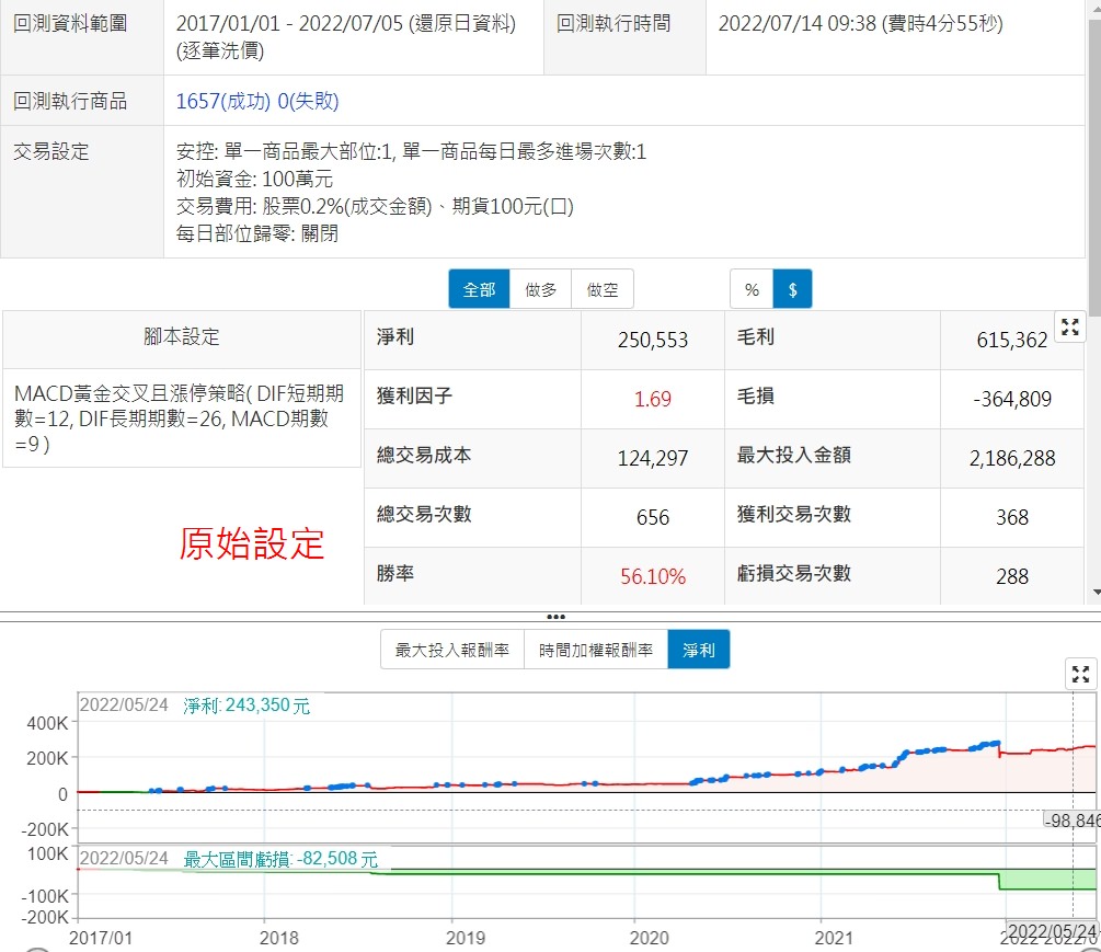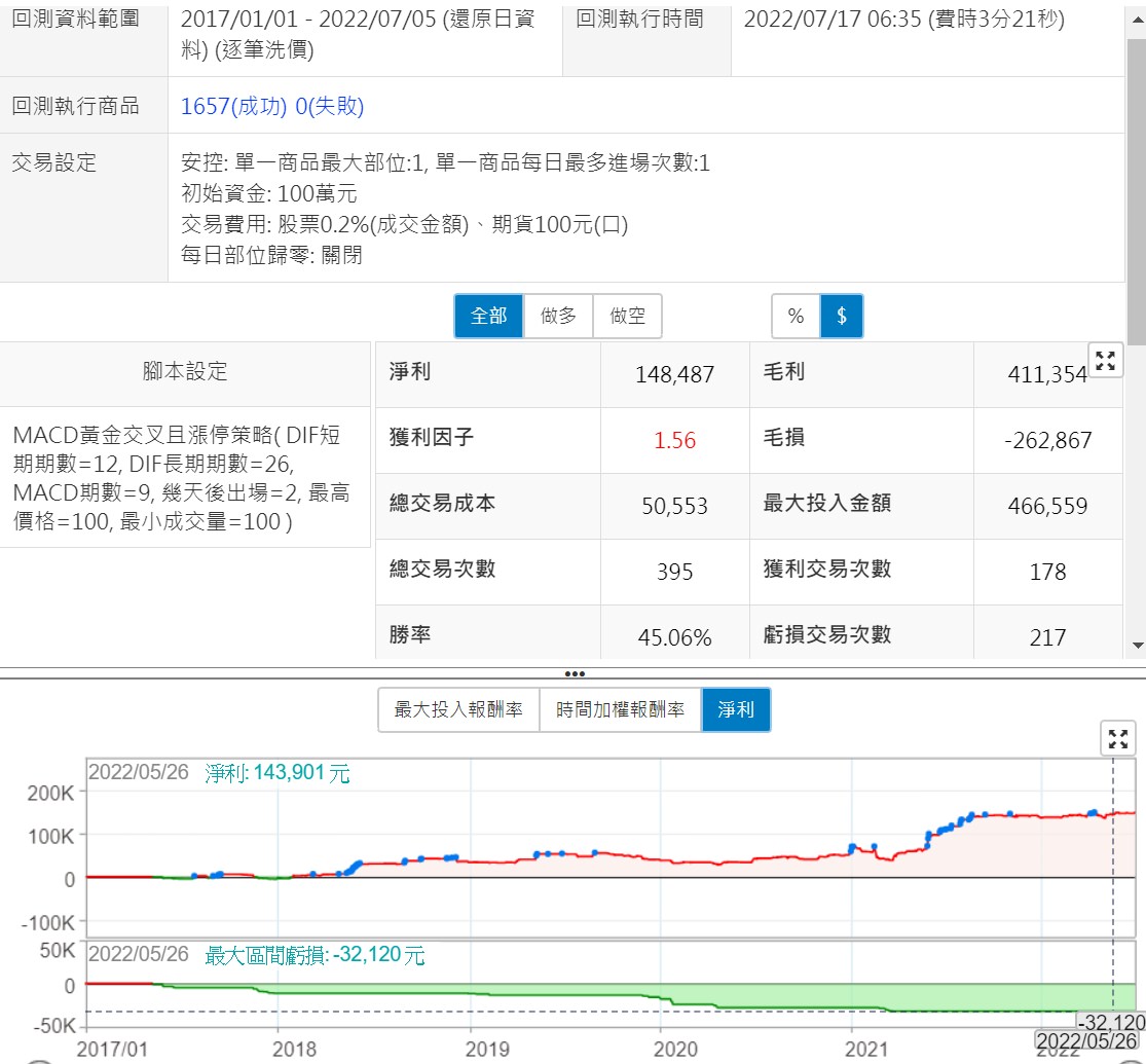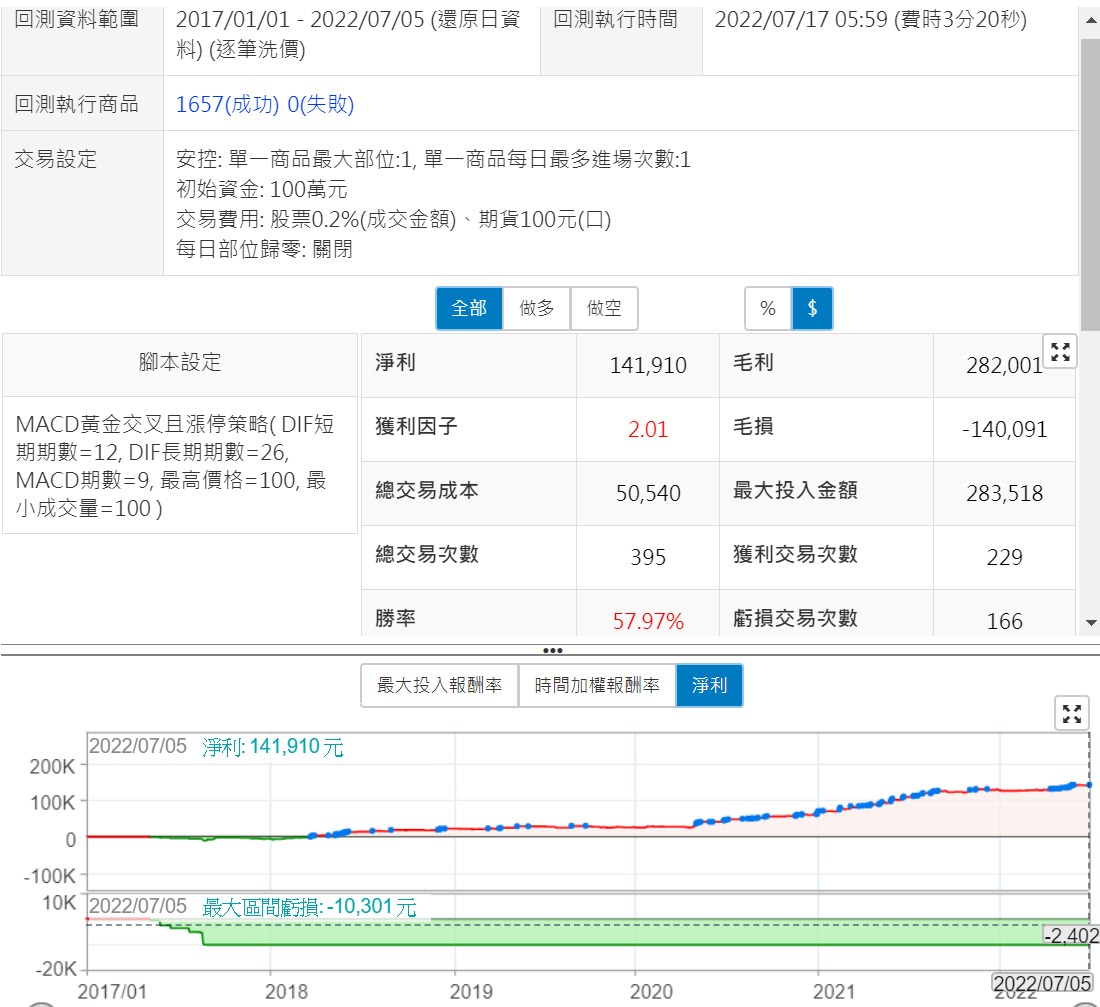 XQ這次提供的MACD黃金交叉且漲停策略,原本是個雷達用的策略,把它改成了交易用的程式碼,參數都不變的情況下,績效就還不錯了,在增加了價格與成交量的限制後,數據表現更好,幾乎接近可上線程度了,另外,我們將這個策略提到的條件改為input值,更方便大家調整回測