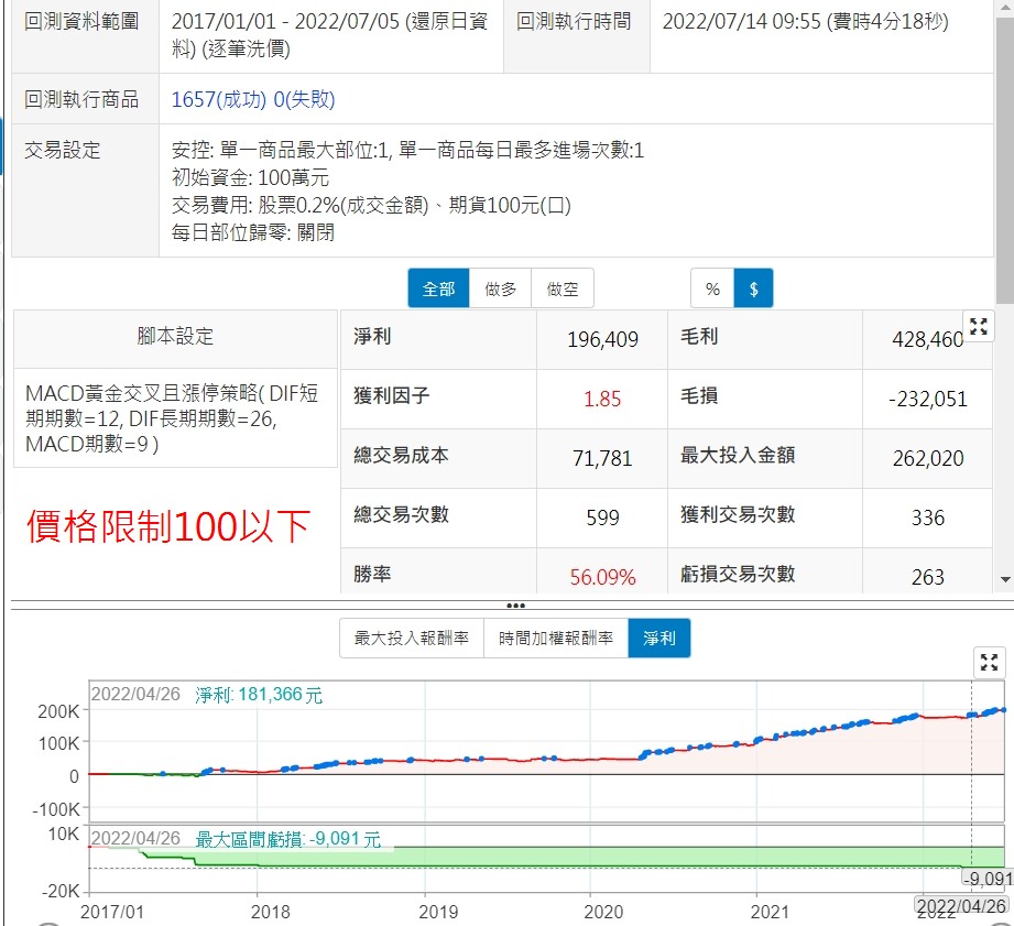 因此,本次回測,加入一段程式碼將價格限制在100以內,重新回測後,勝率雖沒啥變化,但淨利曲線更平順了,最近竟然還是在創高的,且最大投入金額降到26萬,最大區間虧損降低到連一萬都不到,感覺真是有點猛猛的了