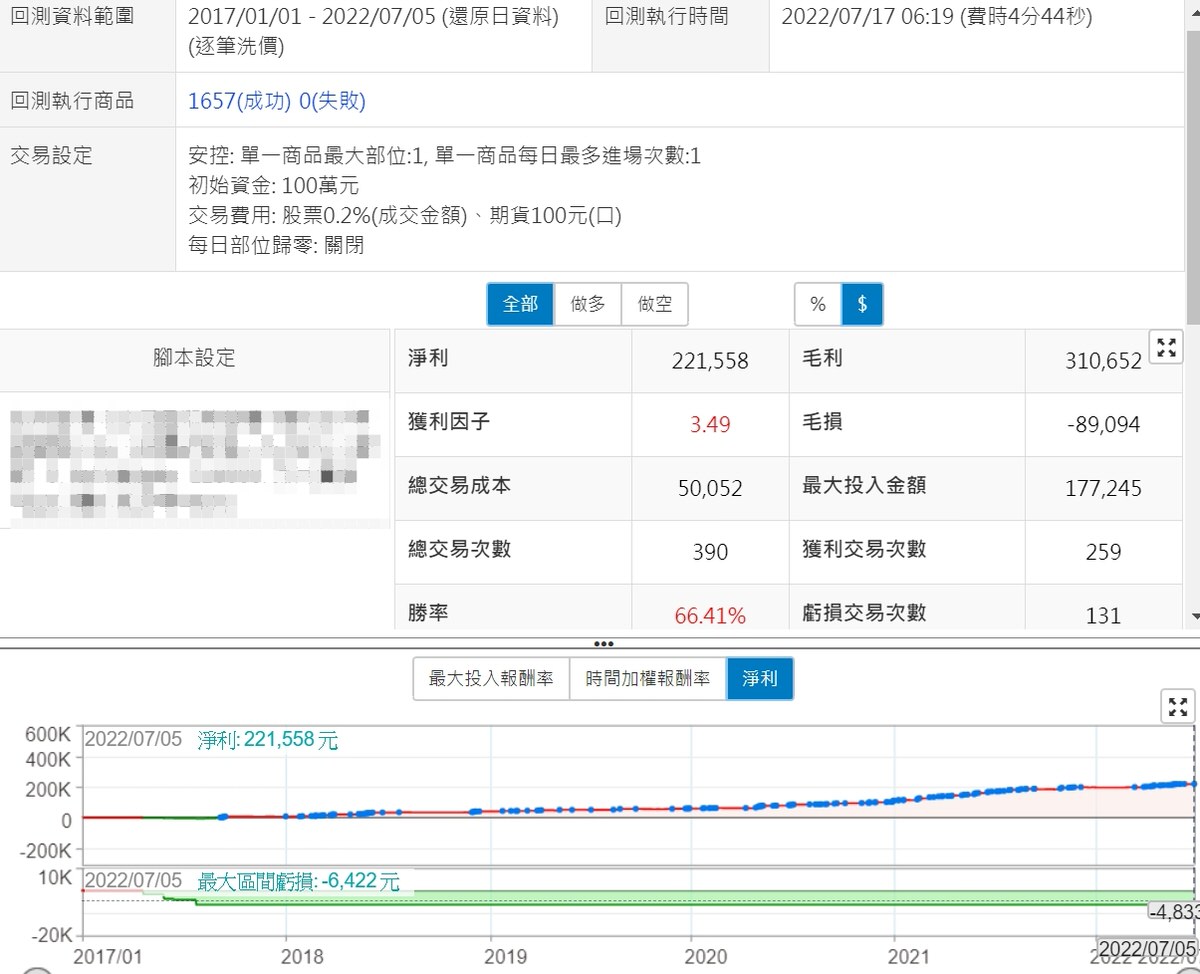 PS: 策略內大立光造成的虧損,如果是用選股的回測,是很容易被忽略的ˊ,因為是用報酬率做計算而不是淨利,沒有看到實際金額的變化,很沒去注意高價股對整體損益的影響