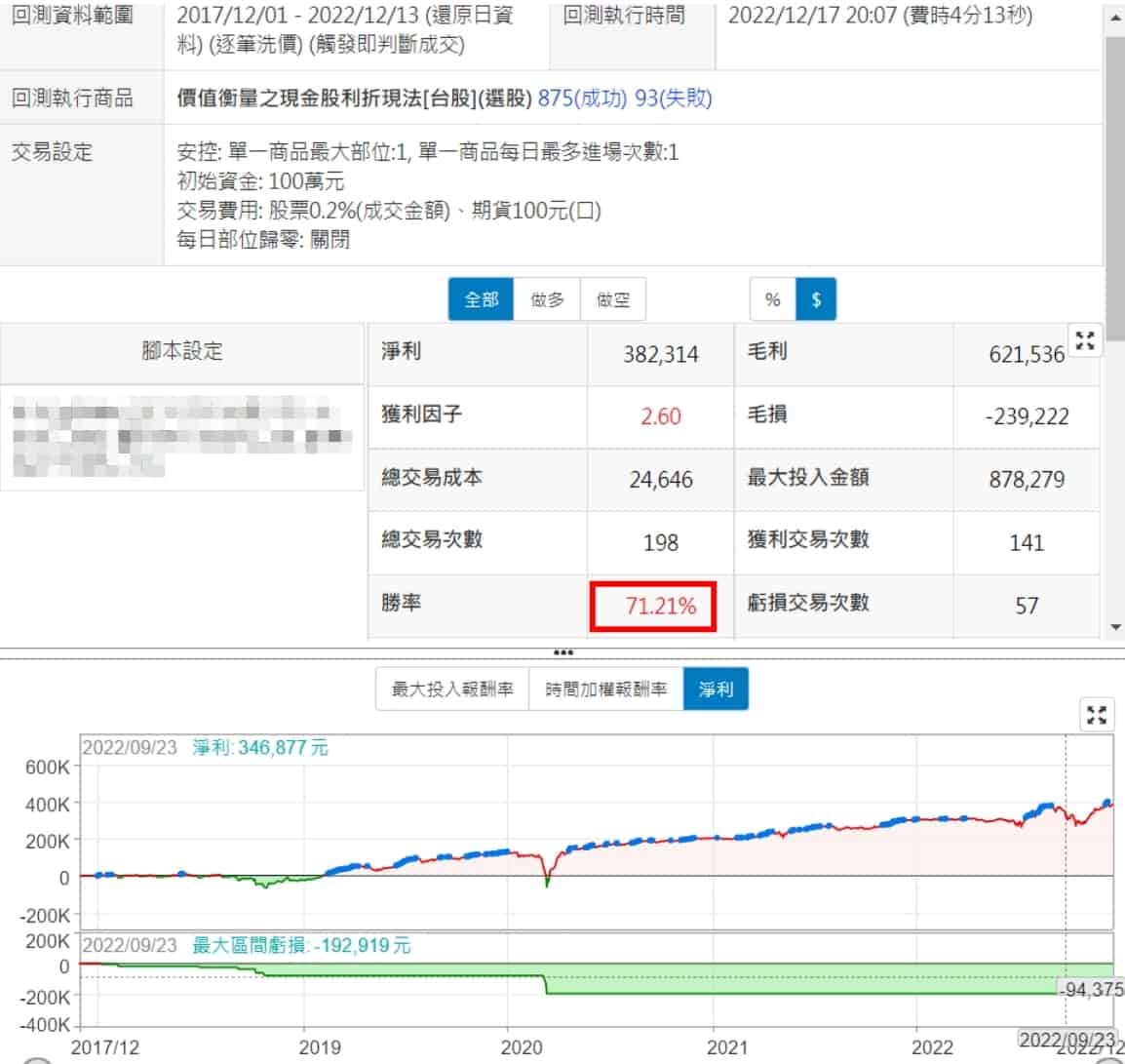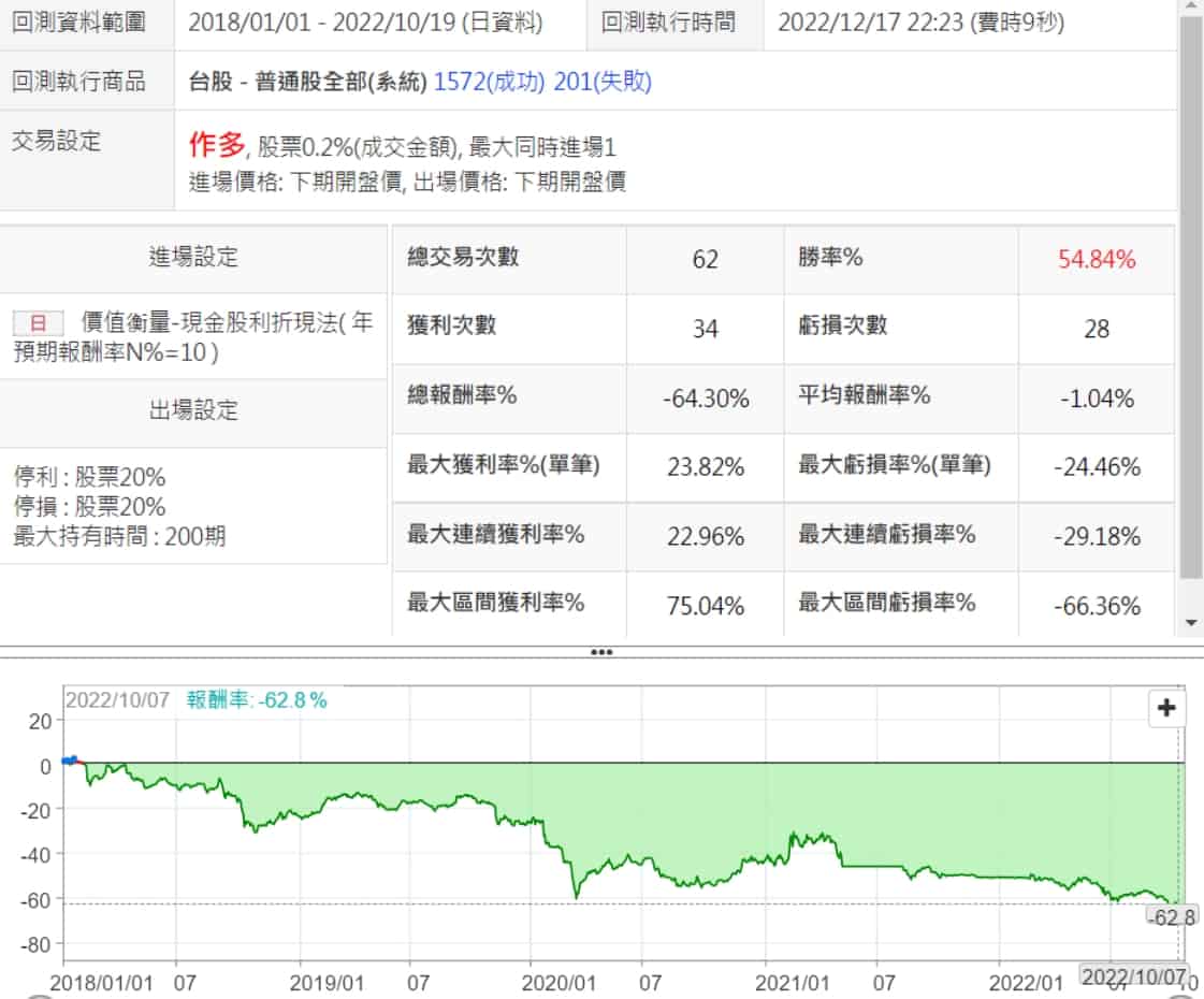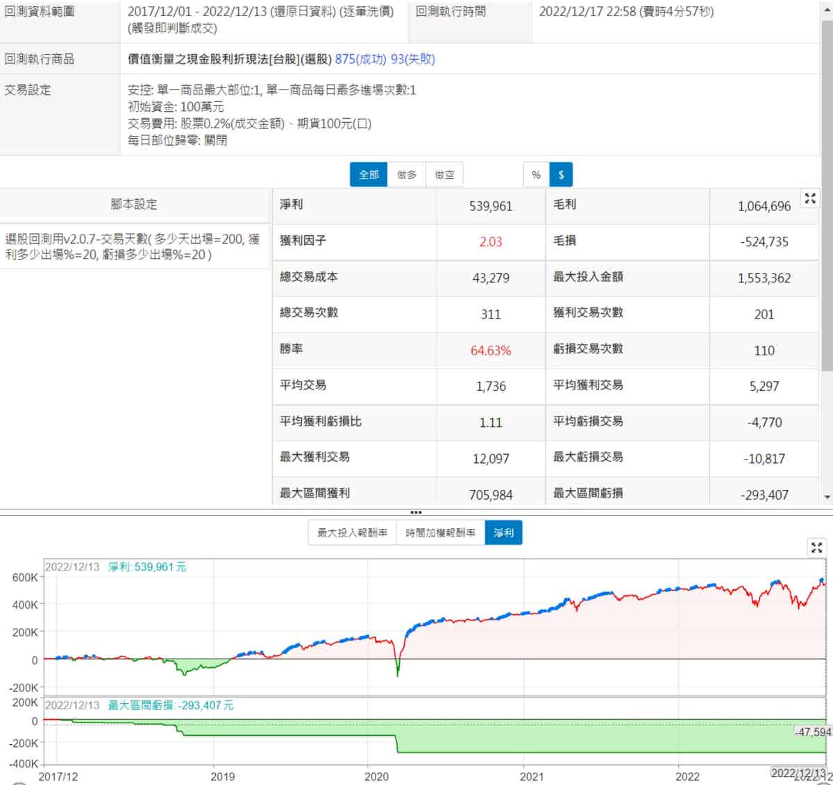 採用XQ預設的條件+全部的上市櫃股,因為是價值型選股,所以將停損利設的較高20%,且持股達200天,得出一個有點慘的狀況