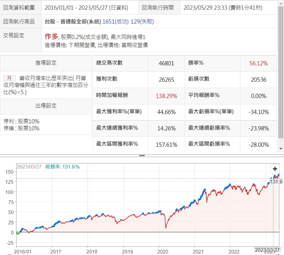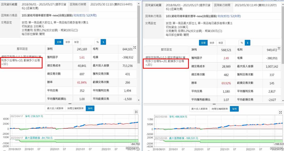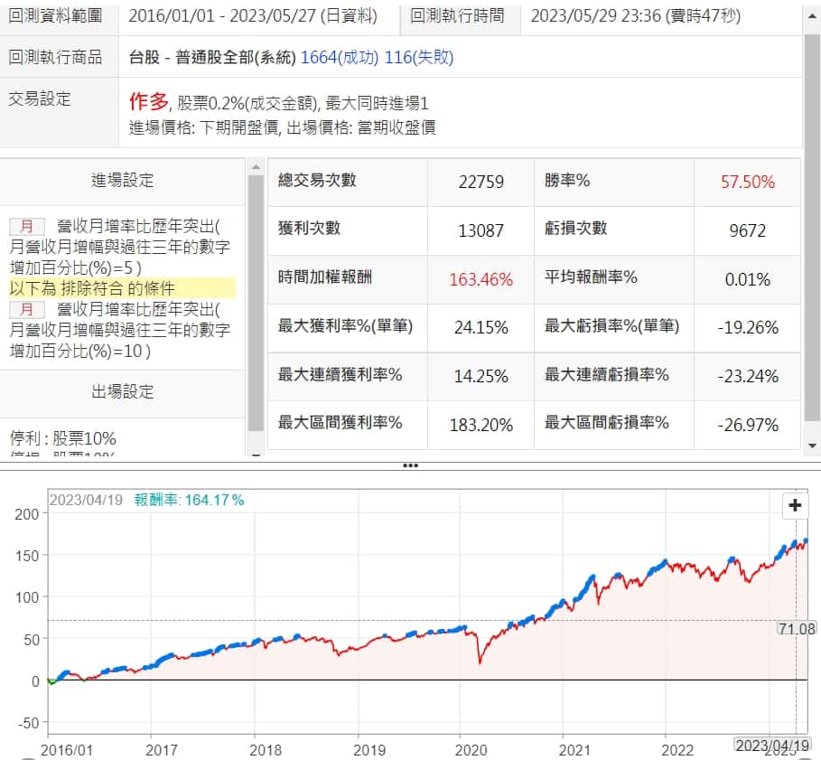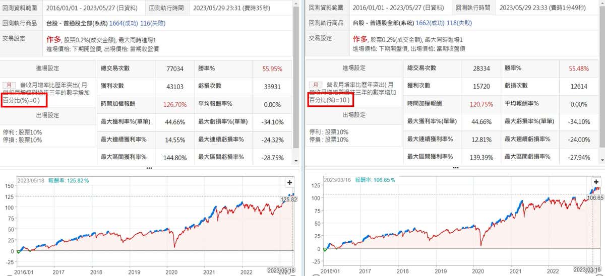 近期月增率要比過去多多少,才會是一個比較好的衡量數值呢? 只要高於過去平均時會不會就可以了,還是要高一點更好? 以下兩組回測,一個是比過去平均高0%,一個高10%