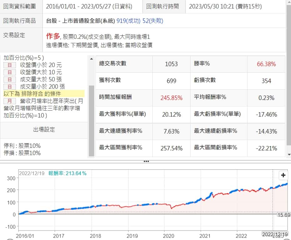 簡單的幾個條件,就可以把績效大幅提升,勝率、報酬率、最大區間虧損改善幅度非常大,而價格跟成交量的限制在這個策略中,我覺得也是滿合理的,價格低點可能還沒開始漲,但不能過低,不然有可能有些會下市,而這在回測中是不會告訴你的,而成交量低表示還沒被市場注意到,先佈局買進,等後面人抬轎
