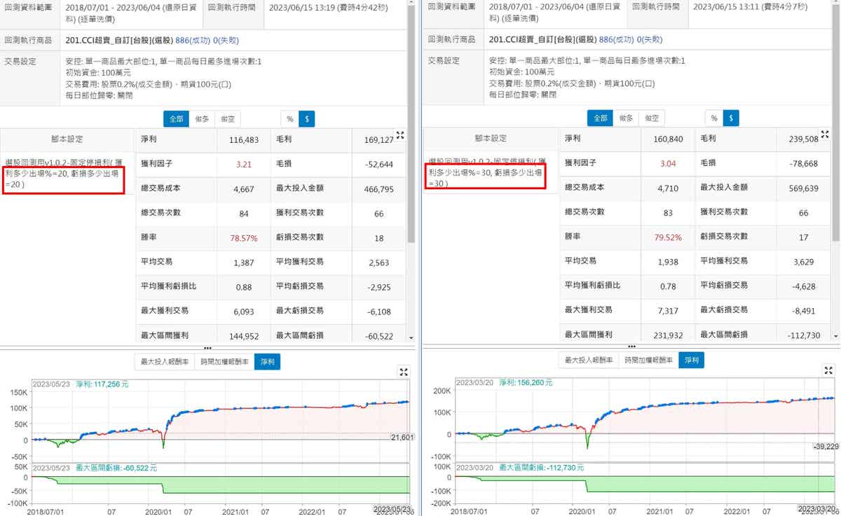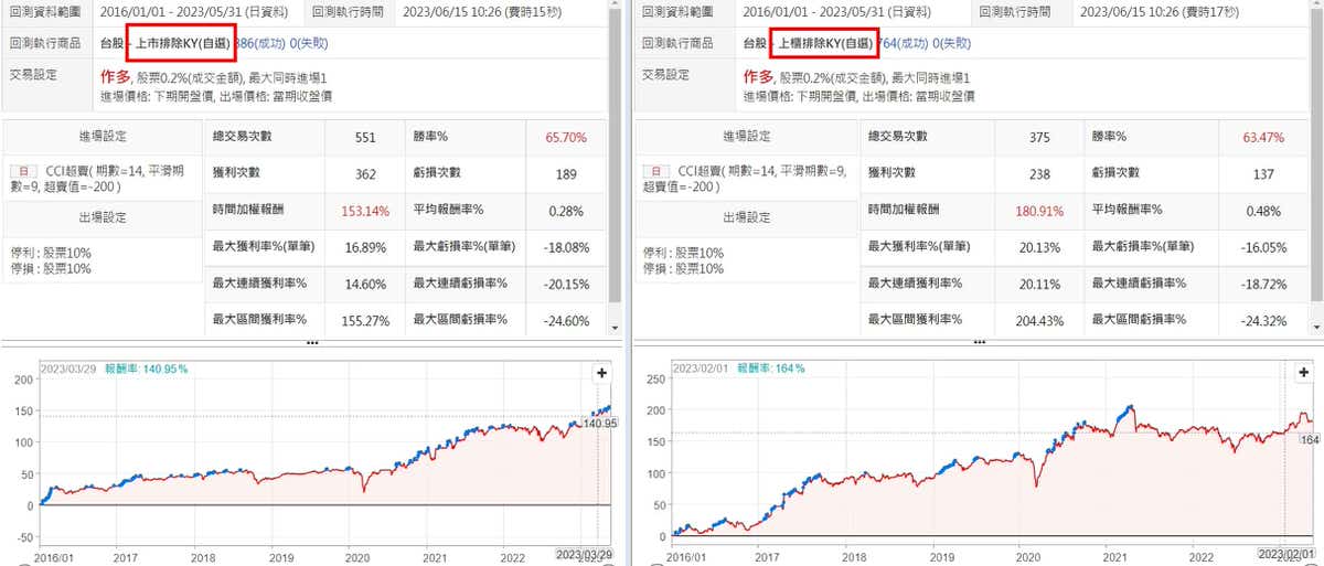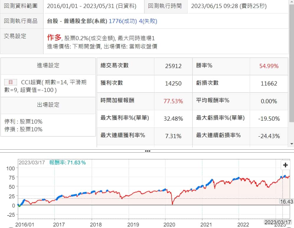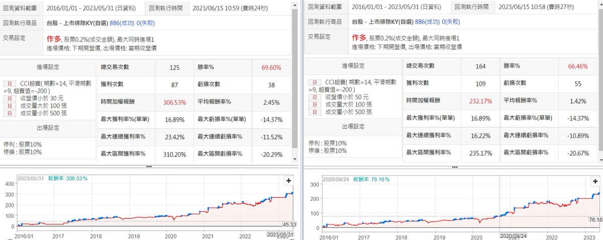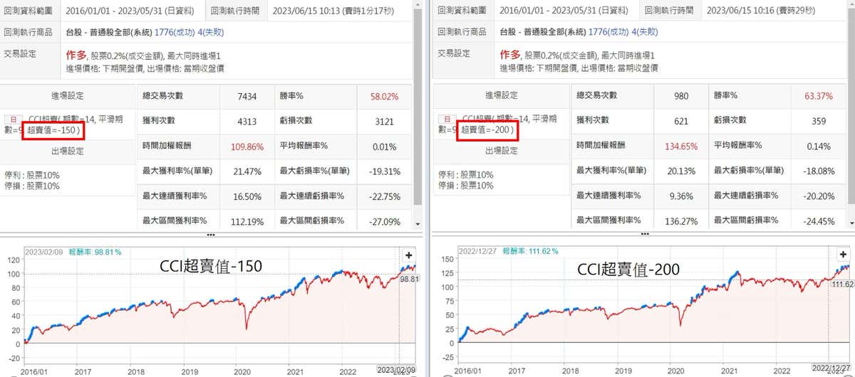 將超賣值調整為-150跟-200做回測比較,可以很明顯看出CCI超賣值是-200的時候,回測的各項數據都比預設值跟CCI超賣值是-150的時候好許多,勝率提升到六成以上,報酬率也超過了100%,下面會採用CCI賣超值-200這組參數繼續回測