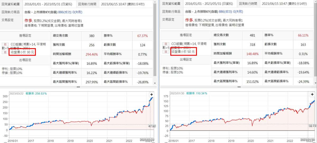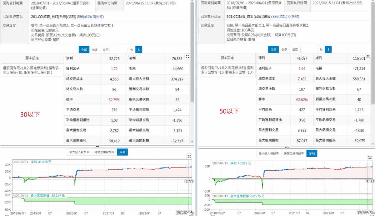 將收盤價限制在30跟50以下做回測,兩個的勝率又比上面更高了,而且績效曲線更為接近左下往右上的方向成長