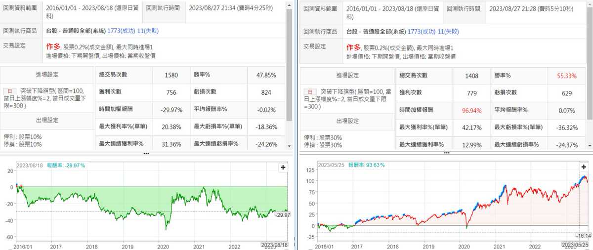 採用預設值回測,將停損利設為10%跟30%分開做回測時,可以很明顯的發現,這個策略不適合停損太小,幾乎都在虧損的狀態(左圖),推測是因為雖然突破下降旗型,但股價還不到馬上翻轉的程度,還會上下震盪,且由於趨勢還算偏往下,所以進場後,很容易碰到停損出場,而當停損利設大一點的時候,如30%(右圖),反而不會因為震盪而很容易被掃出場,能夠等到之後的反轉並且獲利出場