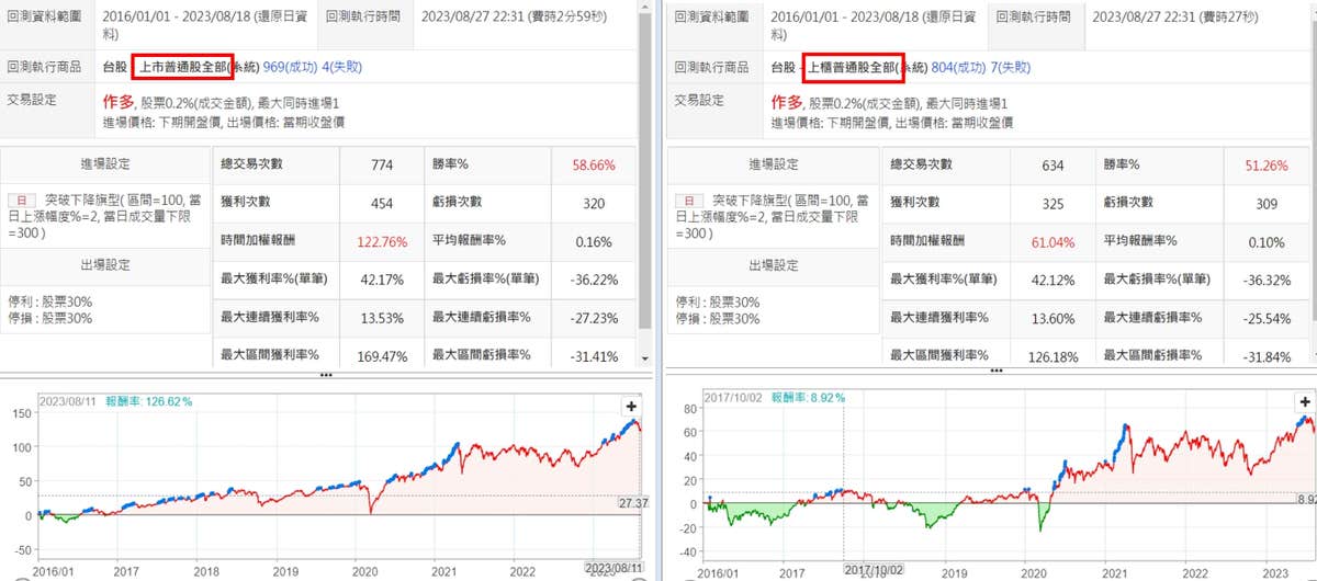 上市櫃分開回測 採用預設值、停損利30%,將上市股跟上櫃股分開回測,可以很明顯看出,即使在停損利30%的情況下,上櫃股的表現跟上市股比較起來,是很不穩定的,本策略,採用上市股應該會是較佳的選擇