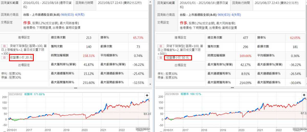 價格 將價格區限制在20以下及50以下分開做回測,兩個的表現似乎差異不大,雖然價格限制在20以下勝率有較高,但似乎較不穩定,創高的頻率反而變低