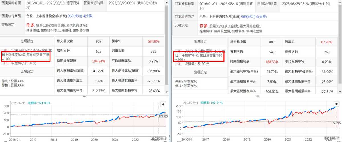 調整漲幅與成交量 這邊將最小漲幅調降為0%,並且同時降低最低成交量的數量為100跟200,從回策可以看出,漲幅調降且成交量越低時,績效反而好,不管是勝率、報酬率、最大區間虧損,都是比較好的,不過這邊要注意的是,成交量過小,滑價可能大,且不一定能買到回測的價位,不過,在這個策略中,或許滑價的影響沒有那麼大