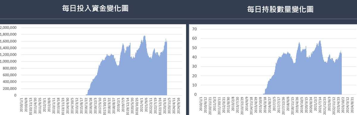 而用資金的變化圖來看,最大資金使用大約在160萬,但平均大概落在120萬,如果用平均值且不用複利來計算報酬,每年投入120萬,大約可獲利15% (137萬/120萬/6.5年),這應該比銀行利息好很多、也遠勝存股了吧