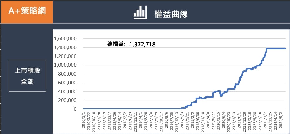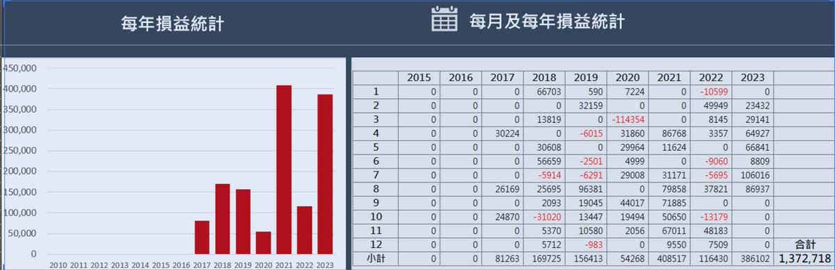 實際損益計算 用A+的Excel工具計算實際損益,可得到如下的結果,大約七年半大約獲利138萬,而且年年獲利