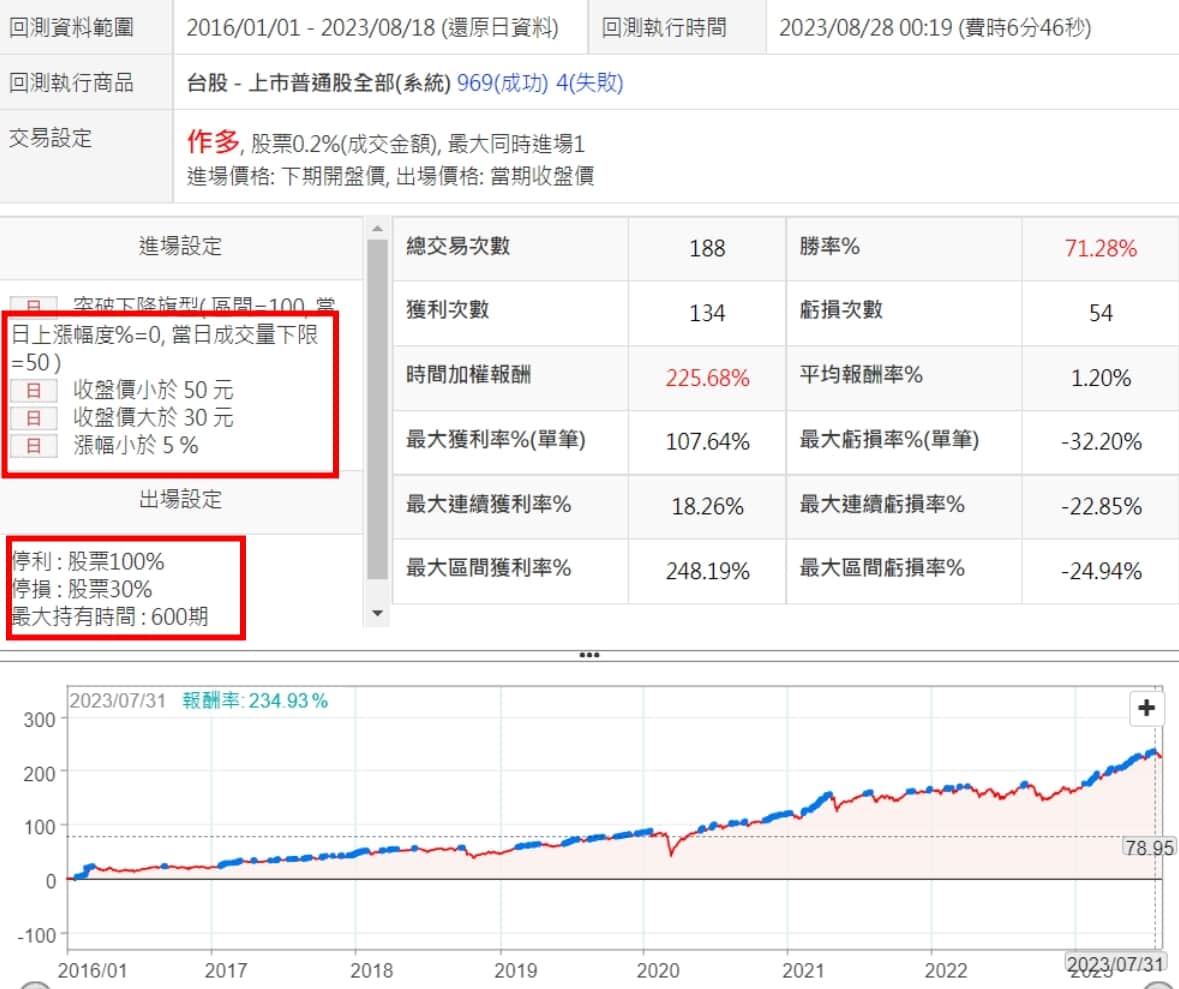 最終調整 這個策略最終將參數調整如下,比較特別的地方應該是停利設到100%,就是一定要賺一倍或是持有600天後出場,而挺損是30%,在這樣的設定下,勝率竟然還能達到七成以上,應該是很不錯的,尤其是換算成實際獲利金額,應該是很令人滿意的