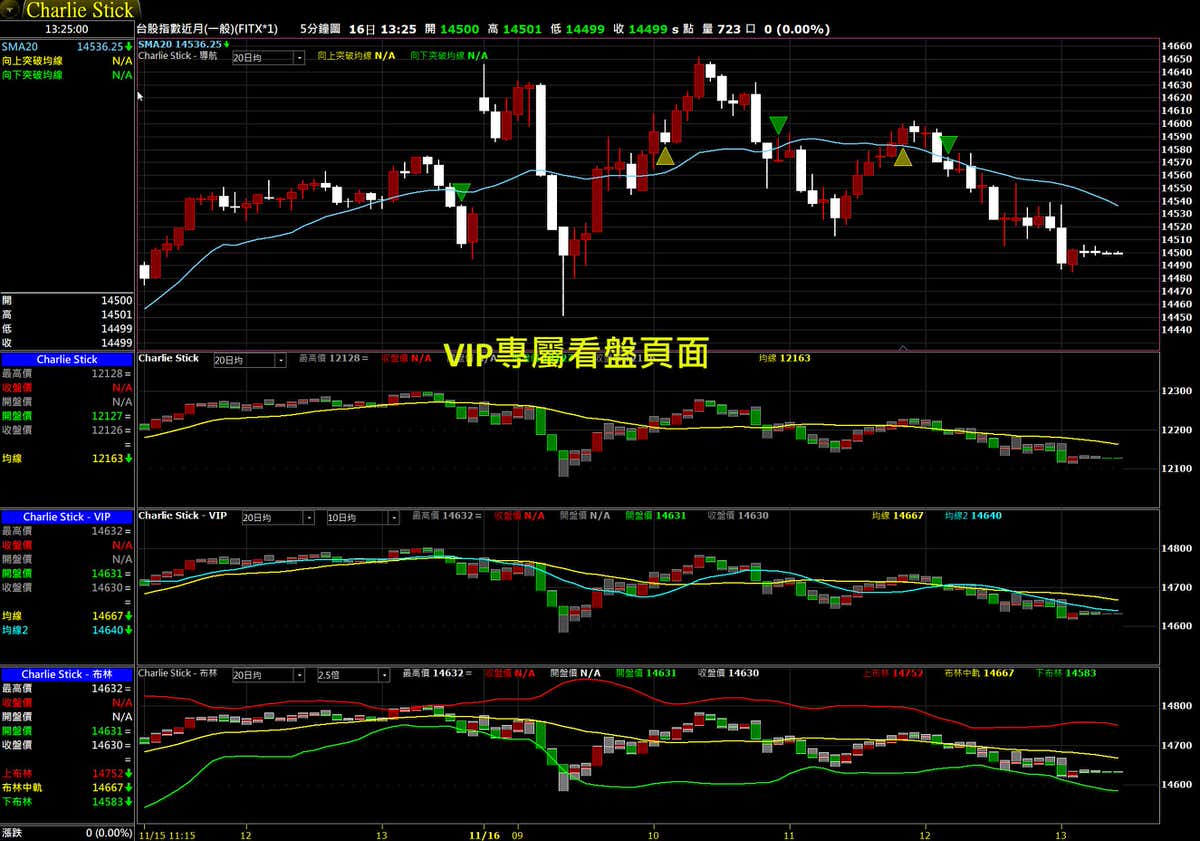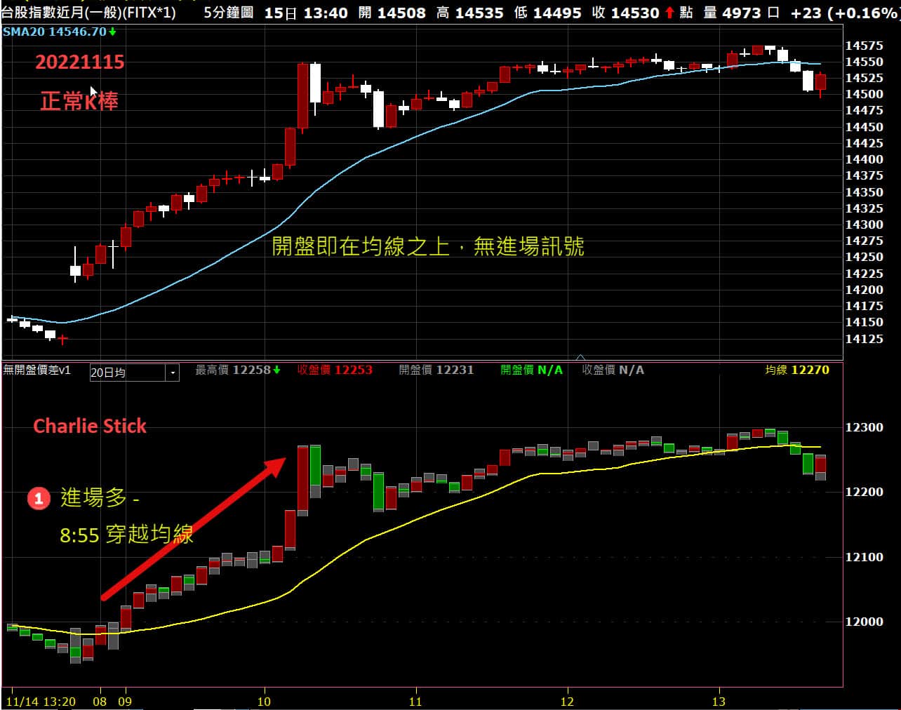 1115則又是另一種狀況,正常K棒沒有機會進場,但Charlie Stick則有機會從8:55進場後,一直到1300才獲利出場,賺到幾乎整段的點數