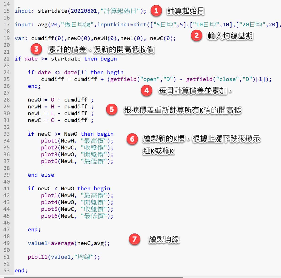 這個無價差的程式碼算是很簡單,主要就是需要指定價差開始調整的一個起始日,之後就是累計每天的價差,將原本的K棒數值,扣掉價差,成為新的開高低收,可以看看下面程式碼的說明