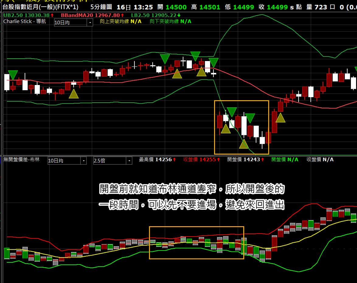 幫VIP會員的頁面,多加了一條均線,布林指標以及導航,根據我自己觀察,可以用布林來濾掉盤整區間,尤其是開盤那段,不會過度的進出場(下圖),或是遇到布林上下軌,開始準備出場等等,自己可以再多多觀察,說不定能發現啥有趣的東西,VIP會員請到VIP文章下載,還沒加入VIP會員的,可以參考這邊的說明喔
