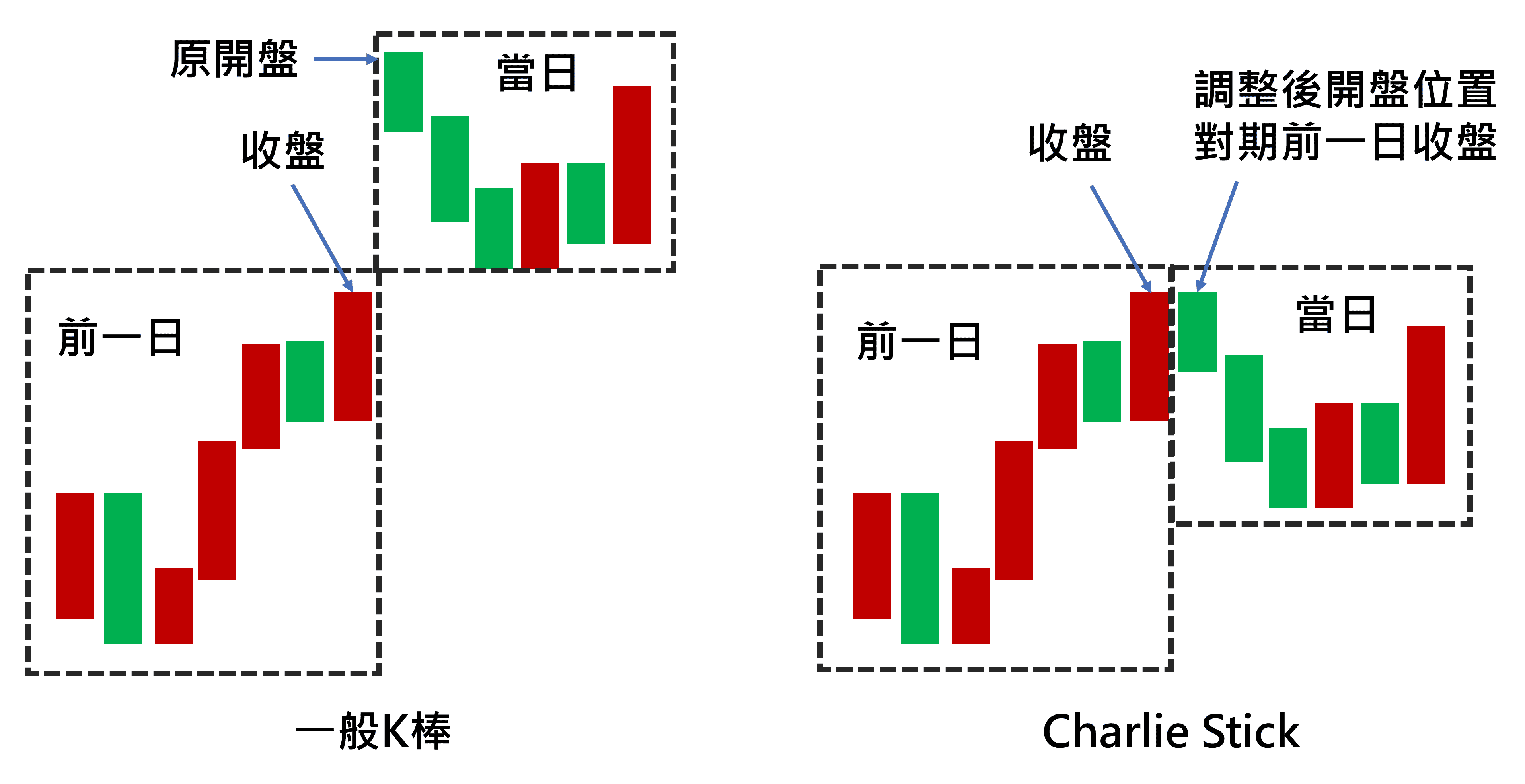 何謂Charlie Stick (感覺用英文似乎比較有格調),就是把每天的跳空都拿掉,開盤價永遠都是前一日的收盤價,如下圖右方,由於跳空都被拿掉,股票價格或指數數值需重新計算,而技術指標,也會用這個新的K棒數值來做運算