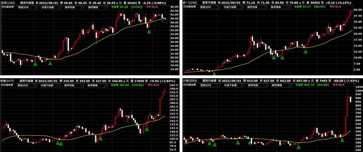 之前都是用選股然後直接回測績效,對於很多習慣看K棒的朋友來說,可能很不習慣也無感,因此,這次嘗試將指標用在看盤頁面,感覺效果還不錯,很容易就可以觀察出K棒穿越了月均線之後的走勢,下面這幾張圖,可以看看三角形出現的位置,是不是出現後多有一段漲勢呢?