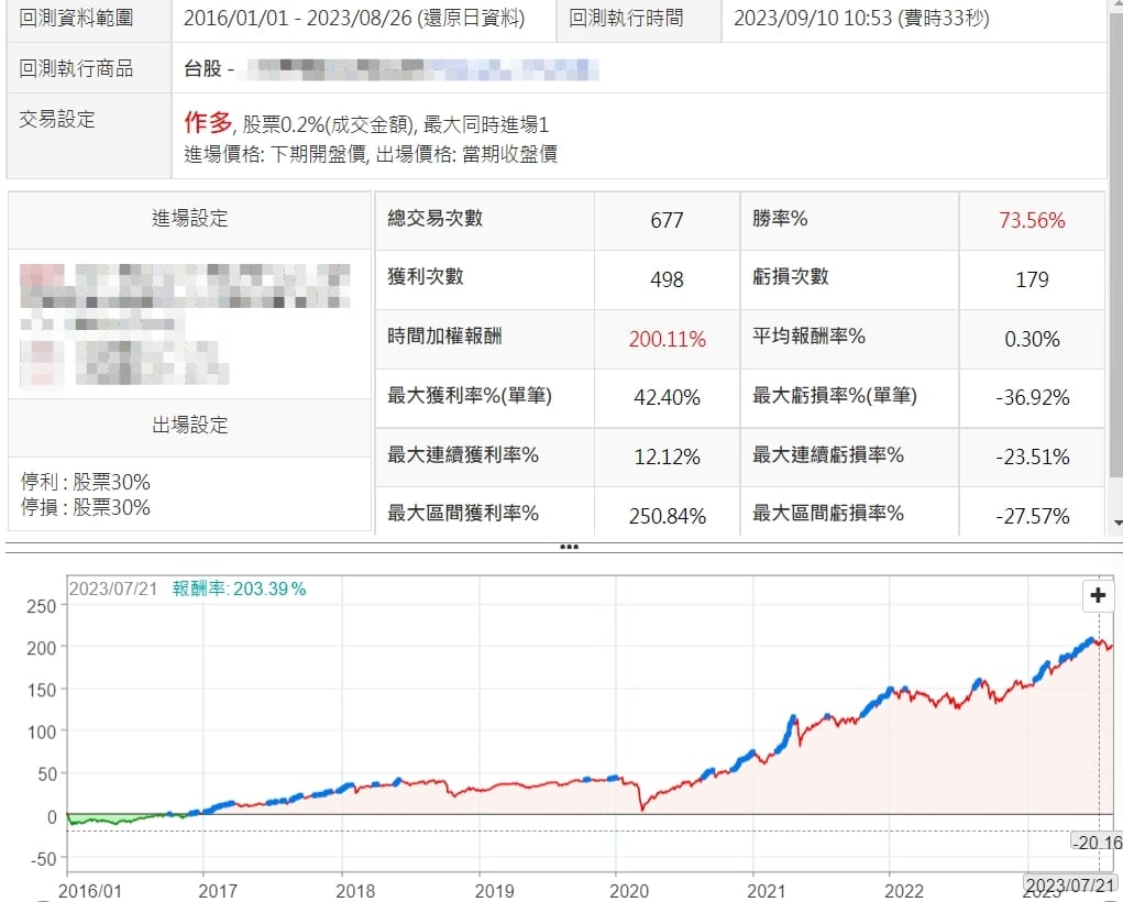 針對VIP會員,這個看盤頁面另外增加了兩個條件,而且把指標跟濾網寫入選股中心做了回測,當停損利設定為30%時,勝率已經可以達到7成以上,而這個策略又是能夠抓到飆股的,如果不用固定停利,改用移動停利,這個報酬應該會更客觀,真的是很值得最深入研究的