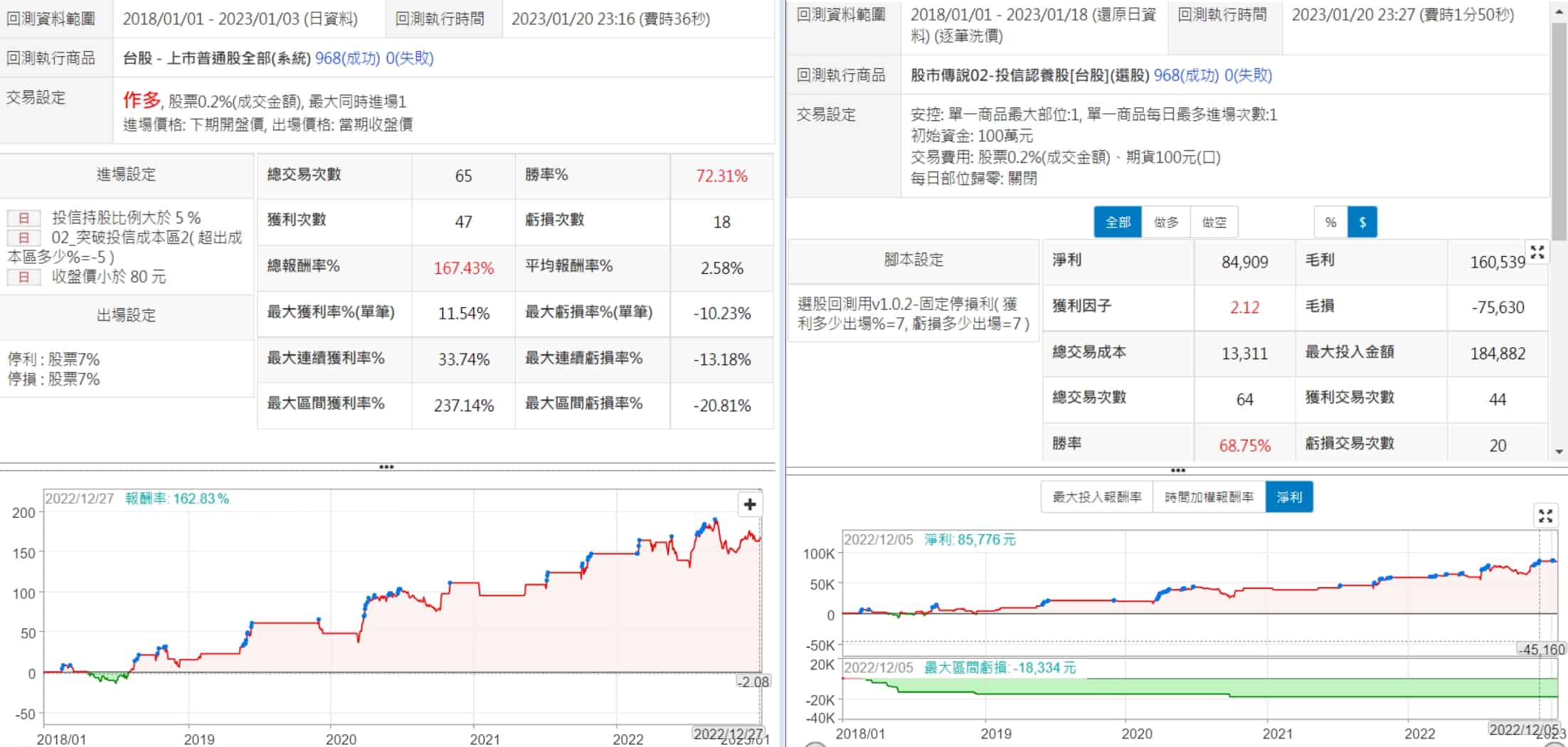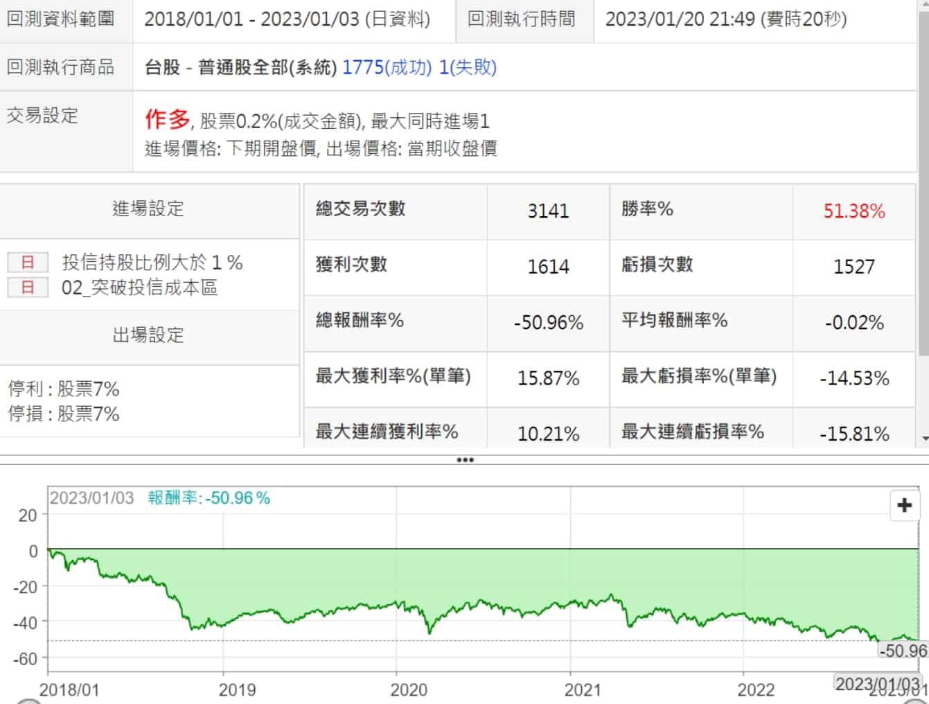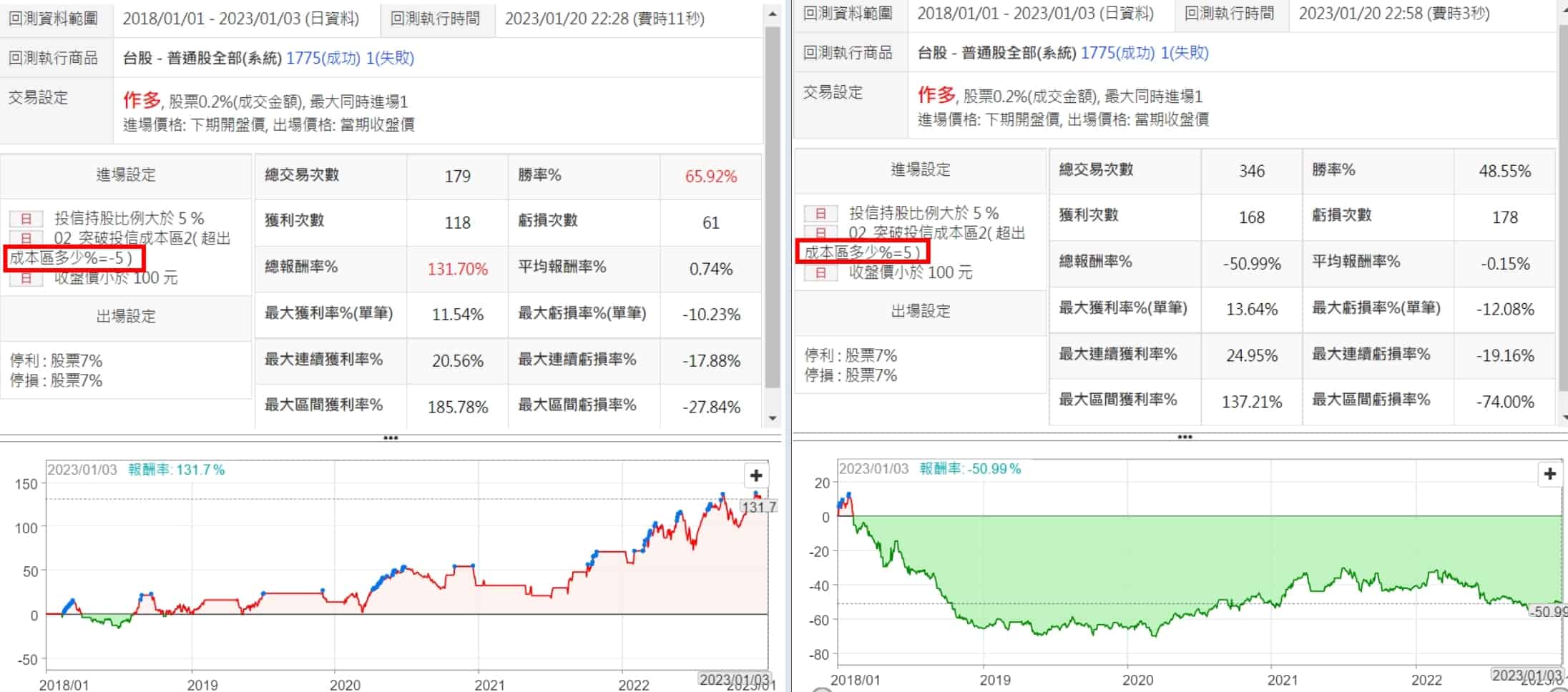 原本條件內有個突破投信成本區,心血來潮,想說試試看,突破不同成本區會不會有啥差異,所以重新調整了腳本,可以調整要突破的區間,而這邊比較有趣的是測試突破原本上的5%跟-5%,其中-5%代表的是突破成本的95%那個位置