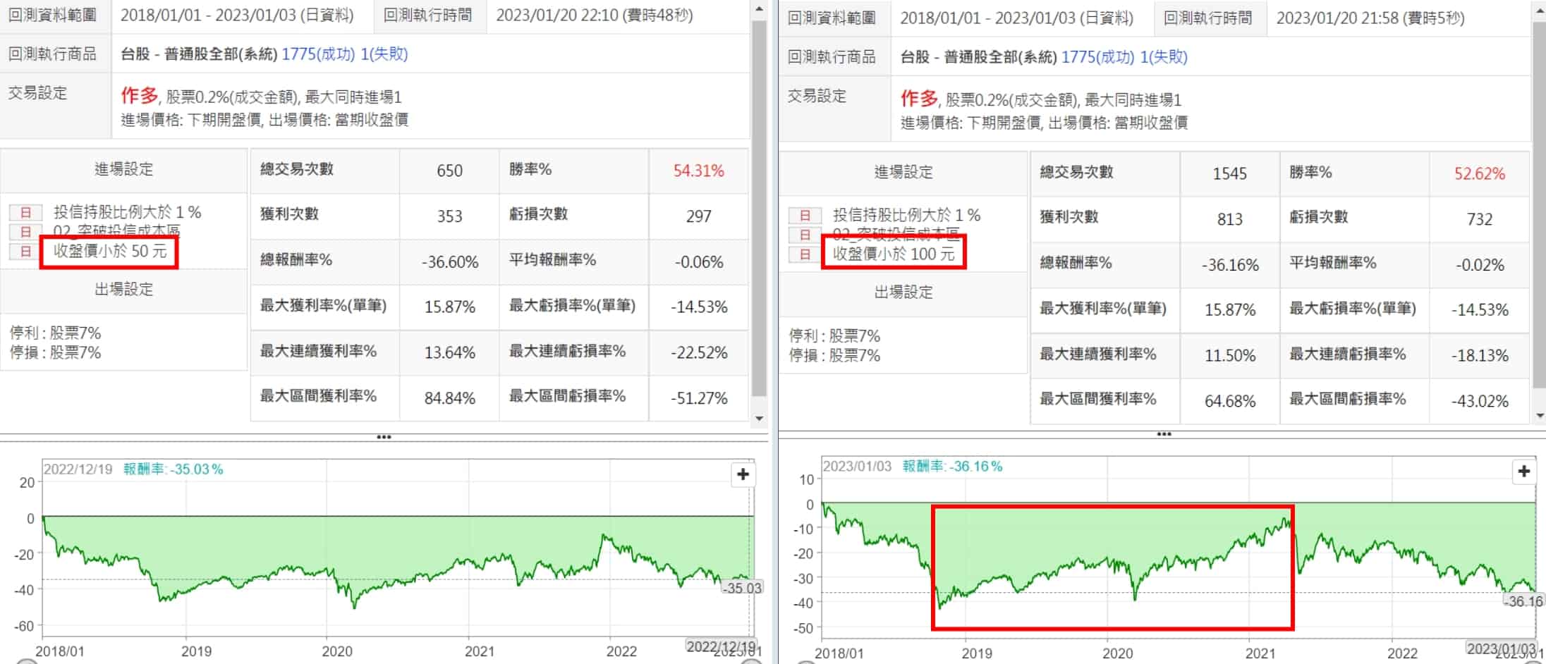 增加價格條件,限制50跟100以下的股票來回測,績效看起來是有改善的,尤其是收盤價小於100時,回測報告顯示2019~2020的報酬率有明顯的向上