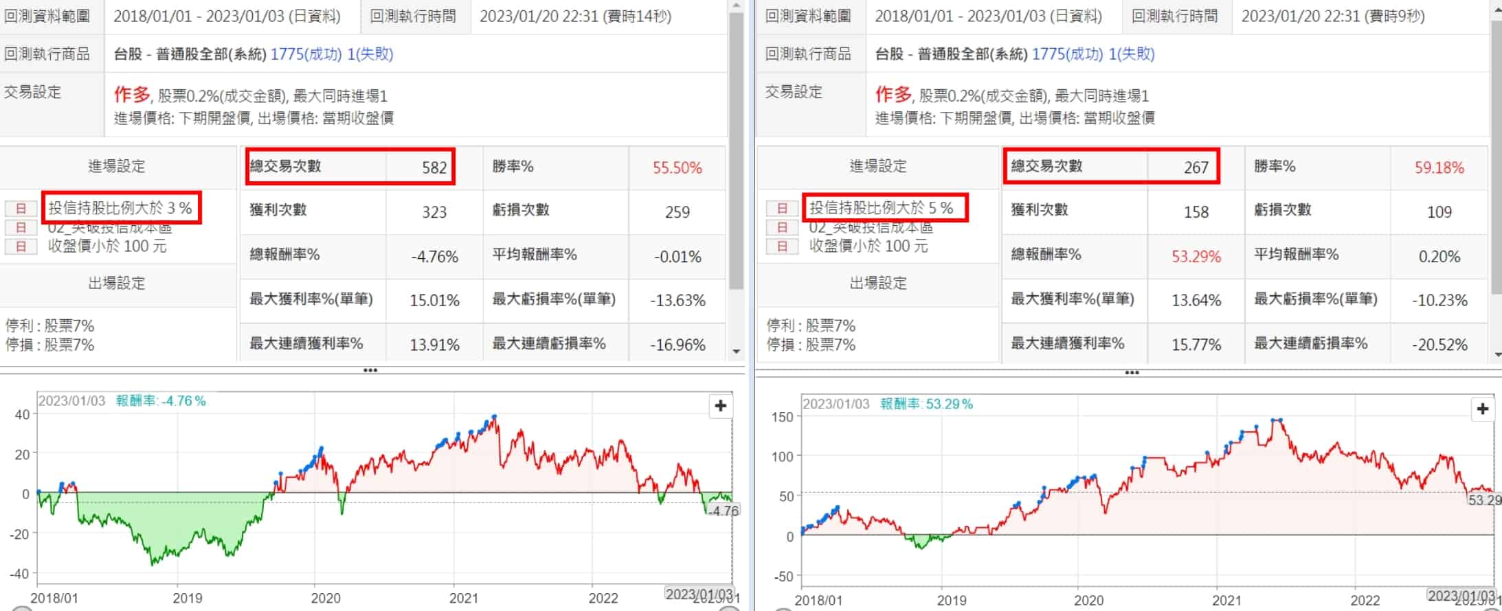 把投信持股比例下限從1%提高為3%跟5%分開回測,可以明顯看出,當投信值股下限越高,績效表現越好,勝率提高不少,報酬率也變正的,但同時,總交易次數會隨著下限的提高而變少