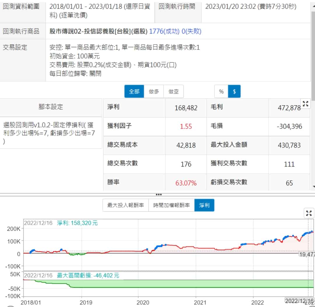 結合4的條件,並調整只採用上市股及價格80以下的股票,選股跟交易模組的回測如下,績效改善不少,兩次創高中間的時間不會太久,但就是交易次數比較少,這個策略的停損利不適合太大,有點像是吃投信豆腐,有賺一點就該趕快閃人