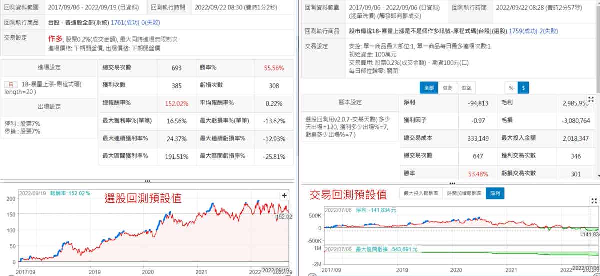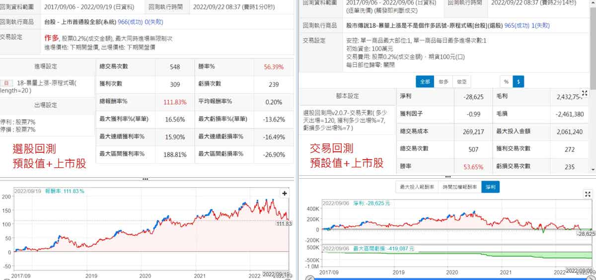 用預設值回測,商品為所有普通股,選股回測結果看來不錯,但用交易回測,就不是那麼美了