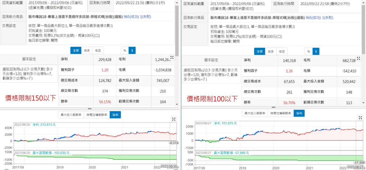 採用回測2條件,只是增加了價格限制,整個績效立刻翻轉過來變成獲利了,可以想像之前績效被高價股嚴重影響,且在做了價格限制後,最大需求資金降低了不少,尤其是價格限制在100以下後,最大資金只要52萬,獲利14萬,雖然換算成每年報酬似乎不多,大約5.3%,但所有交易股票大約有95%但都是在40天內就出場了,可以增加資金使用的效率