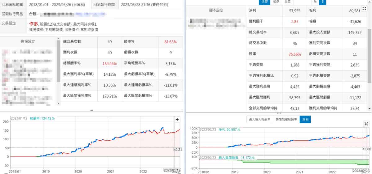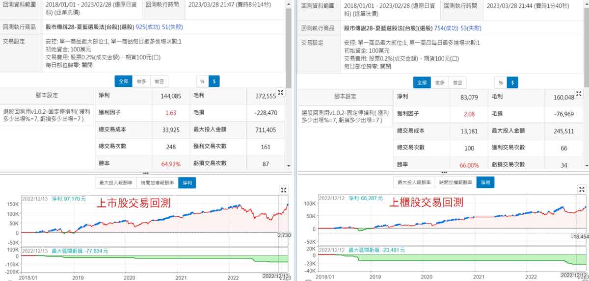 把上面兩個條件用交易來做回測,兩個回測在淨利上的表現都是一直在創高,雖然採用上市股這組的回測,在2022年的回檔較大,但是到今年三月也已經創新高,和上櫃股這組的回測表現又更好,2022年幾乎是到了10月份才開始有較大的虧損,石一樣的到今年3月已經在創高了