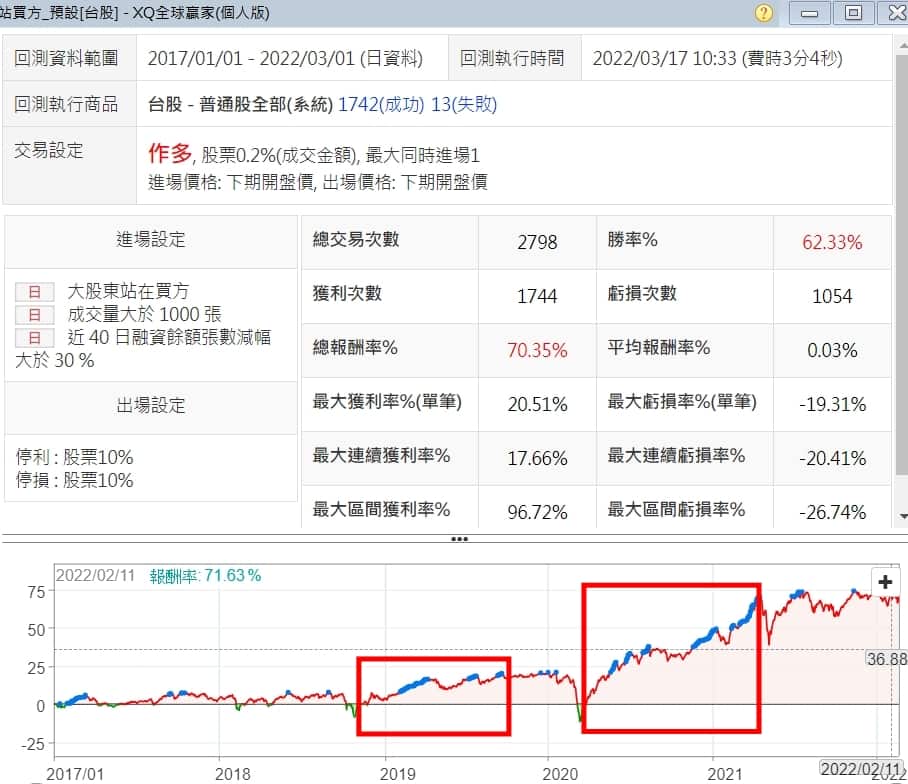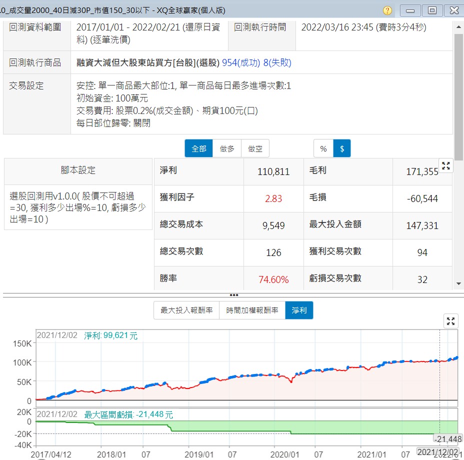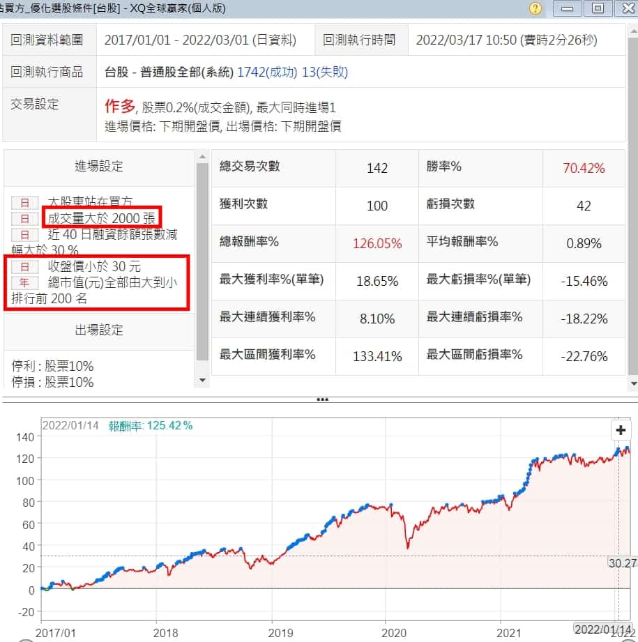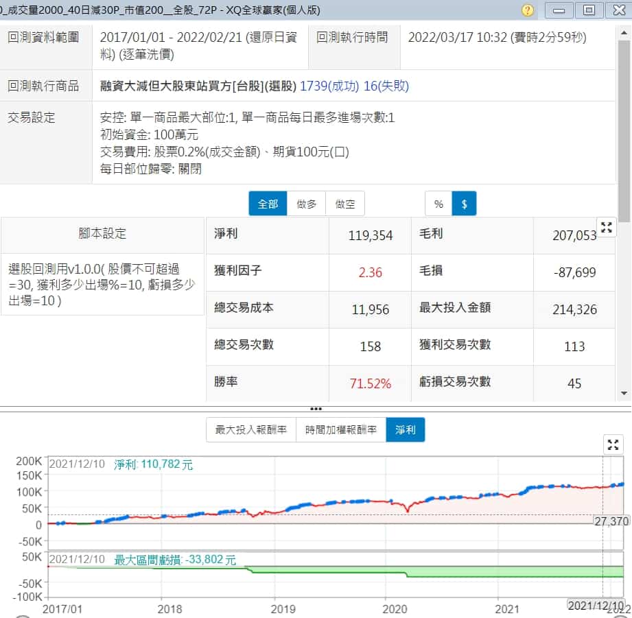 上面的表現,咱們肯定是不滿意的,這個策略優化起來不難,運用成交量、價格及市值三個條件,就可跑出勝率7成的策略,跟上面相比,是不是吸引人多了