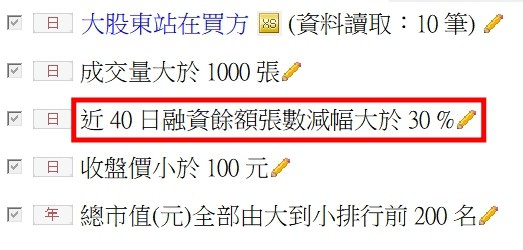 在建立這個策略時,XQ沒有提供融資大減後轉強的程式碼,在選股內找到一個類似的使用,