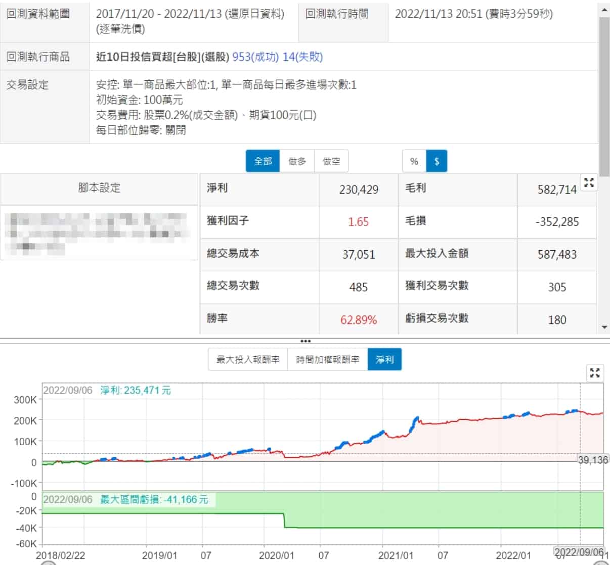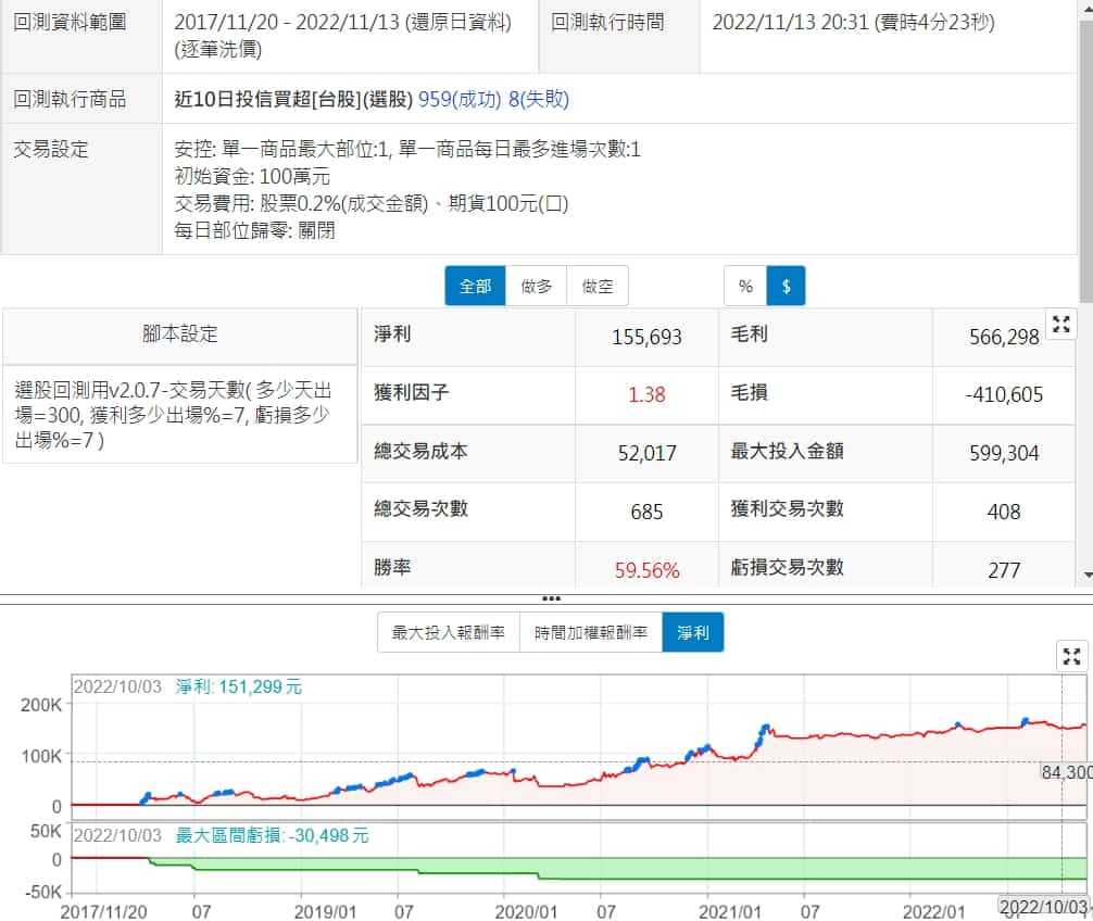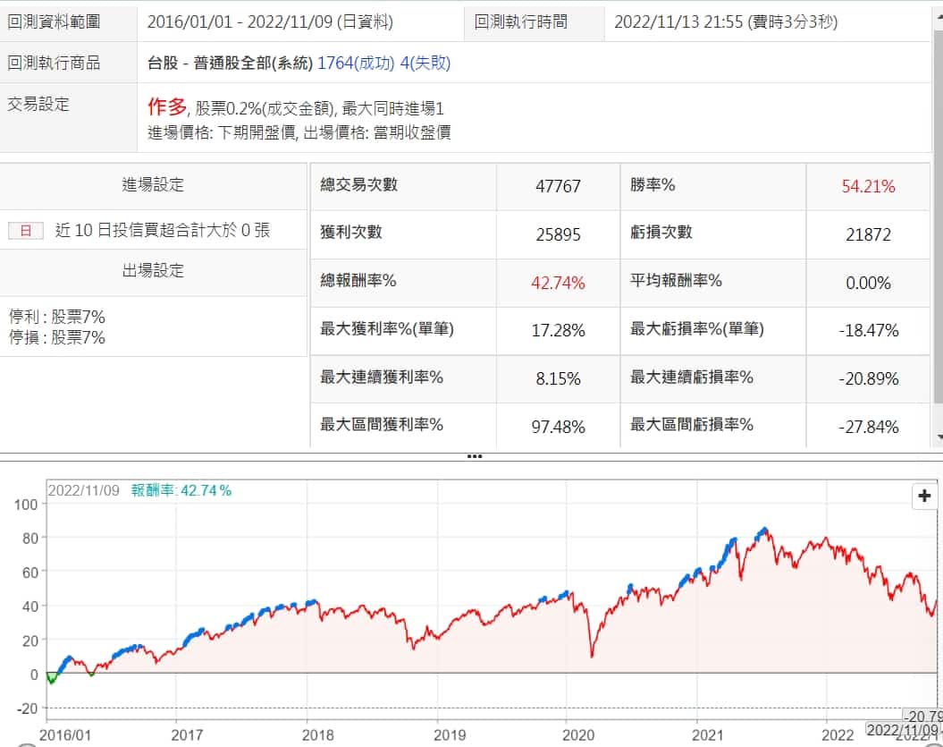 只用10日投信買超>0跟停損利7%去回測,沒想到績效還可以,勝綠大於5成,總報酬也是正的,不過次數要4萬多次,有點嚇人,需要再減少點