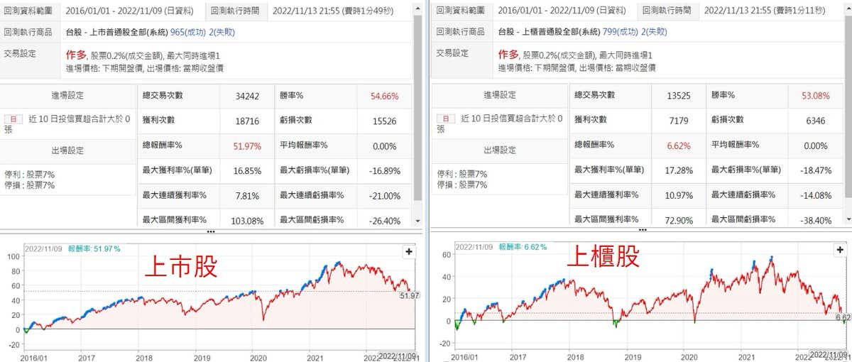 將上市櫃股票分開回測,可以很清楚的看出來上市股的報酬曲線比上櫃股穩定許多,尤其是2022這段,上櫃股幾乎把賺的都賠回去了