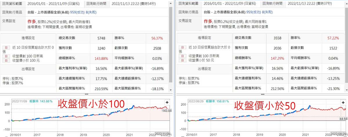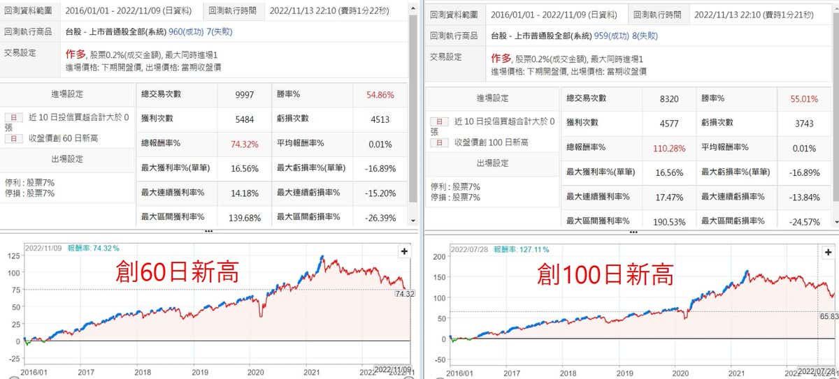 這次採用上市股,增加創高60天跟創高100天的條件做比較,整個報酬率曲線又更平順了,尤其是創高100日的條件