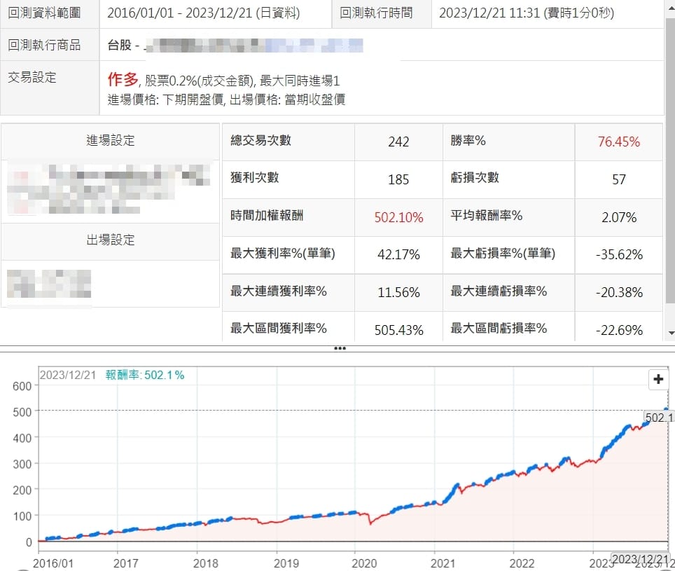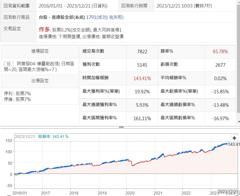 採用原文條件回測,勝率已經滿高了,達到65.78%,報酬率是很穩定向上,區間虧大虧損只有16.97%,但交易次數過多,很難上線使用