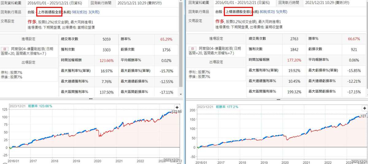 將上市櫃股分開回測,兩個的表現都差不多,上櫃股似乎有表現好一點,不過,後續調整後,哪一個會表現比較好,現在還很難判斷