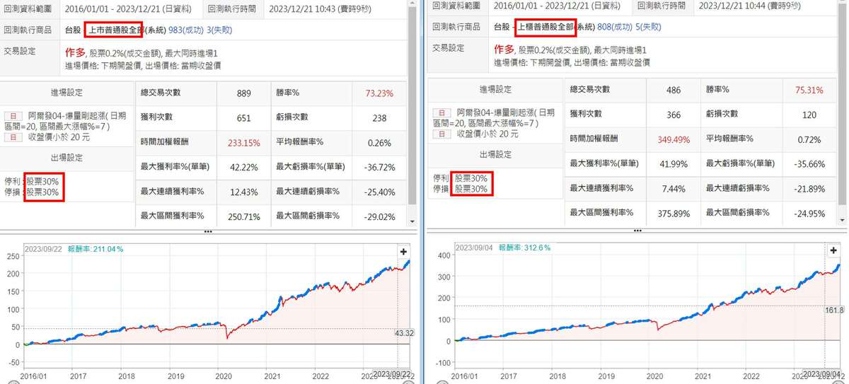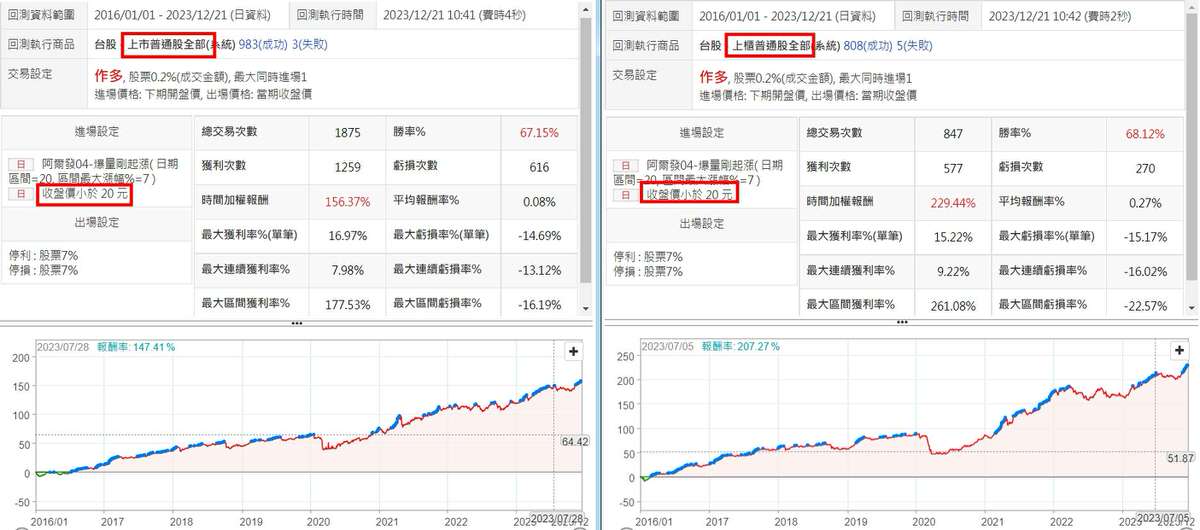 將價格限制在20以下,勝率跟報酬率都略微提升,上市股的報酬曲線似乎變得較為平順,而上櫃股報酬曲線反而開始有較大的起伏