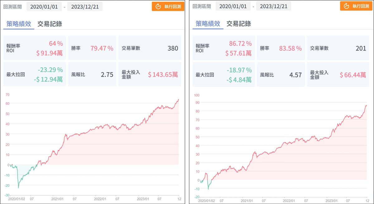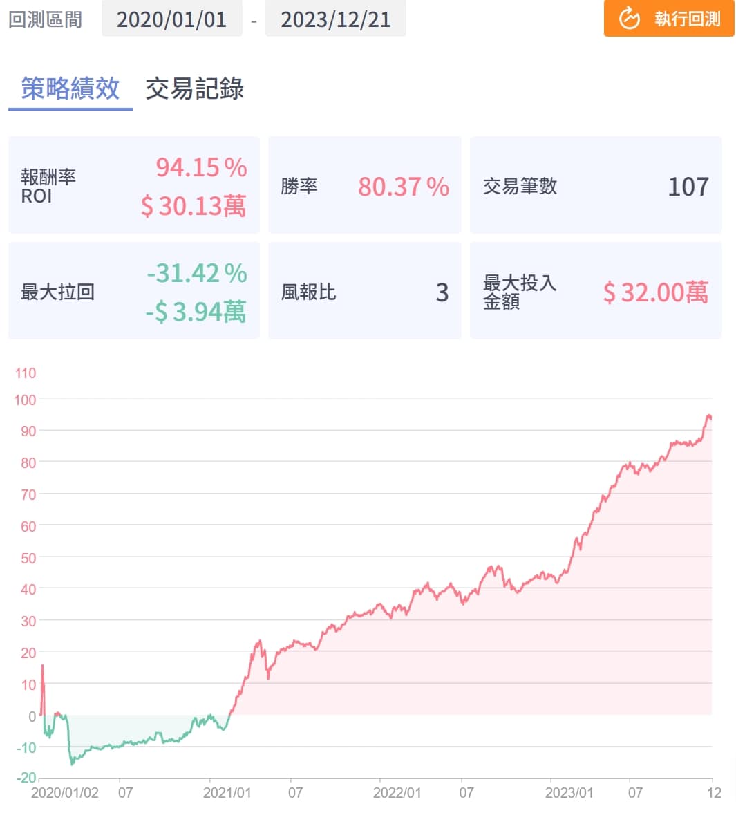 回策過程中,有發現一組參數也不錯,最大投入金額只要32萬,更適合大部分的人,而且四年報酬率達到94.15%,等於一年報酬有23.5%,很不賴吧,這組參數保留給VIP會員,想要的就請加入吧~~