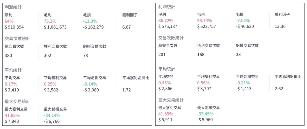另外,大家最喜歡看的獲利因子,上櫃股這邊(右圖)高達13.36,賺賠比2.62,真的很不錯了,自己在調整下,應該很快就能用來實戰了