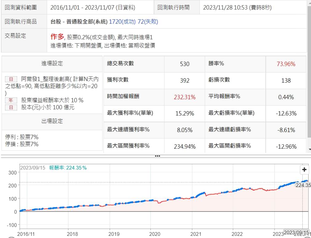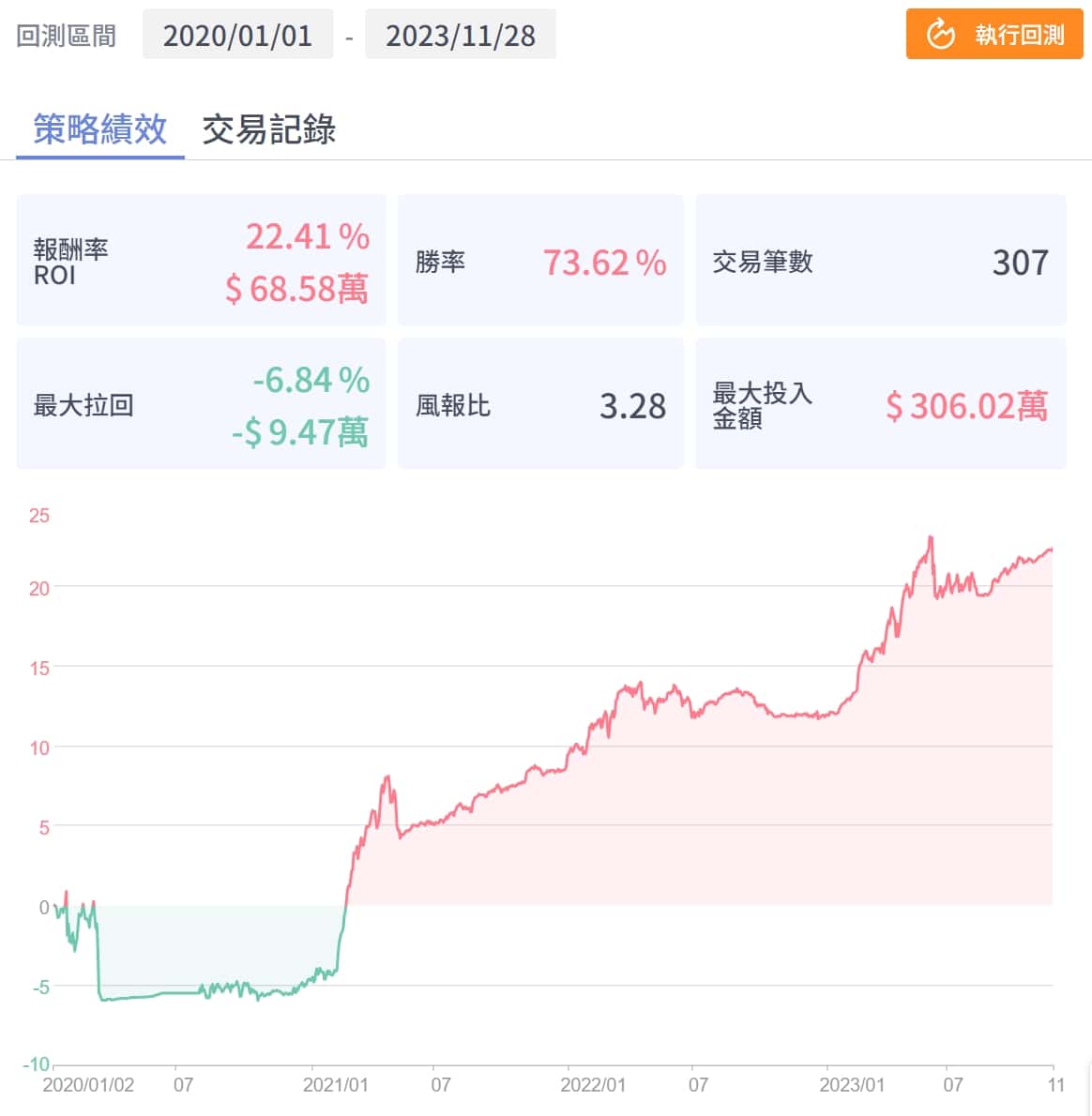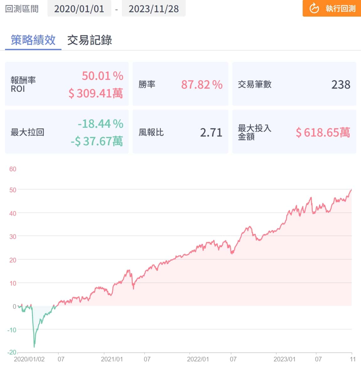 將停損利調整為30%,用量化積木回測的結果是很不錯的,勝率達到87.82%,報酬率也提升到50%, 雖然這跟2020、2021、2023股市一路上漲有很大的關係,但觀察2022年大盤表現不佳的情況下,這個策略依然是能更持續獲利創高,可見這個策略應該還是能適應不同股市狀況的