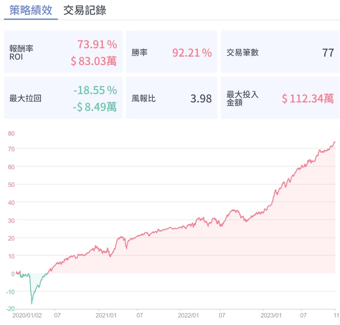 由於上面的策略需要資金過高,因此,這邊嘗試將價格做個限制,經過一番測試後,價格限制在40~60、停損利30%時,報酬率可以高達73.91%,換算一年也大約有18%了,不過這個組合交易次數較少,一年不到20次,但以長期持有來說,20檔股票也算多了,如果你覺得交易次數太少,可以將價格區放大到40~80,或40~70,回測績效都還是不錯的