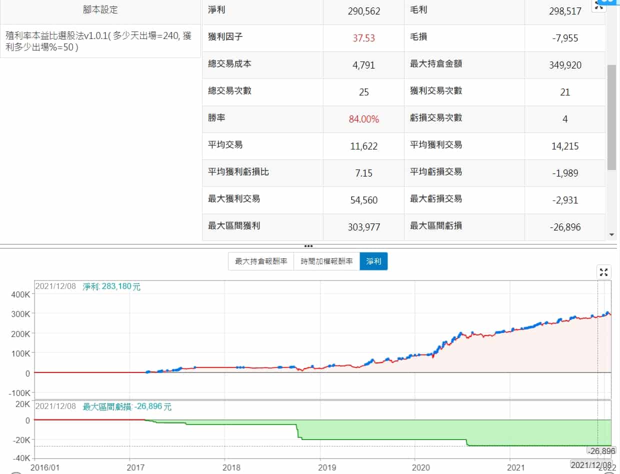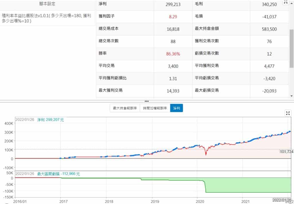 這個策略可能有人會說交易次數會不會太少,有興趣的讀者可以試著拿掉市值一項做回測,其勝率就已經超過了6成5,所以策略基本上已經是不錯了,我只是在這基礎上,再做更多篩選過濾,但應不致有過度的問題,如果希望交易次數可以更多,這樣回測結果會比較安心的話,可以嘗試放寬本益比、市值排名、縮小停利跟出場期限,勝率應該都能在7成以上,自己試試囉。