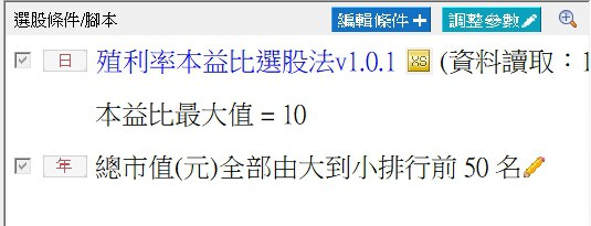 這個策略需要交易模組跟選股模組一起搭配,才能做到回測並達到自動化的目的,誰叫XQ不給力,本益比跟殖利率在交易模組的bug,反應了三個月了,都還沒修復,