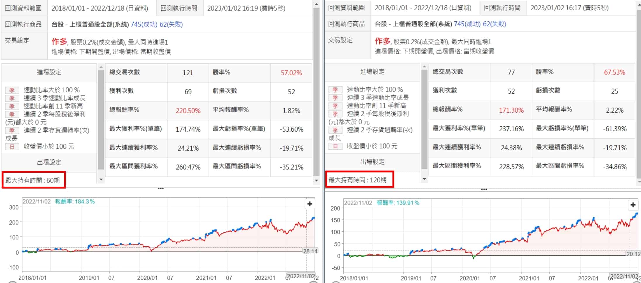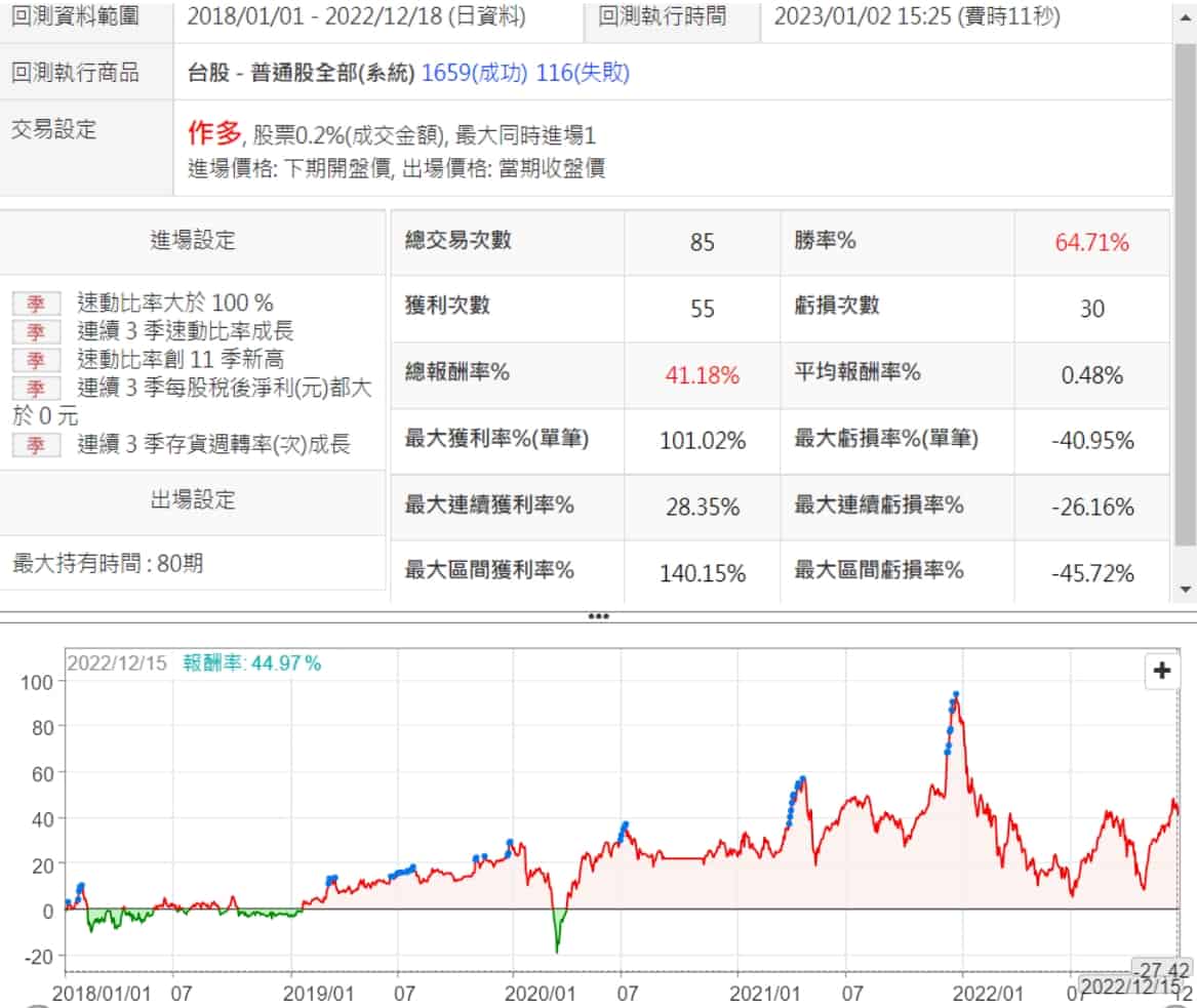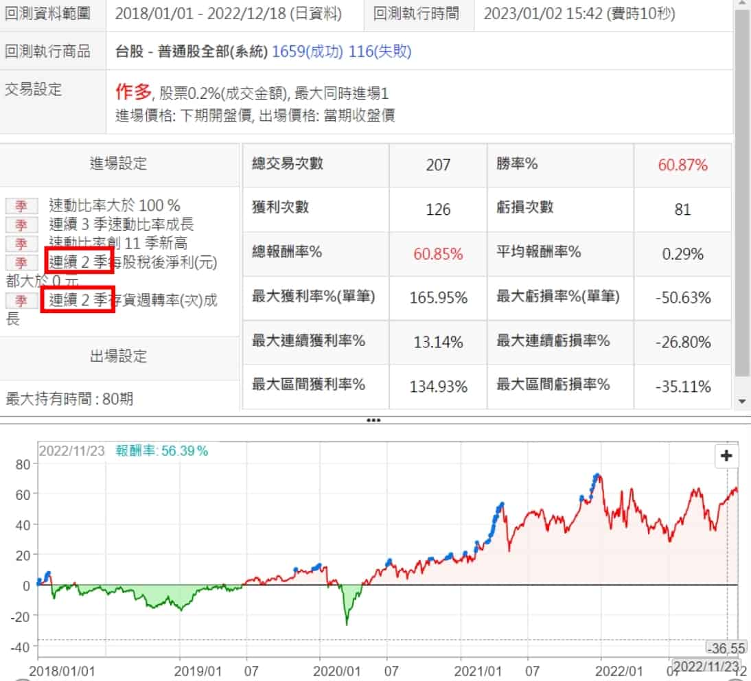 將原本連續三年的每股稅後淨利跟存貨周轉率成長的條件降為兩年,交易次數增加了一倍,但勝率降低到60.87,不過報酬率在2022年似乎有改善,不像原本預設跌那麼多