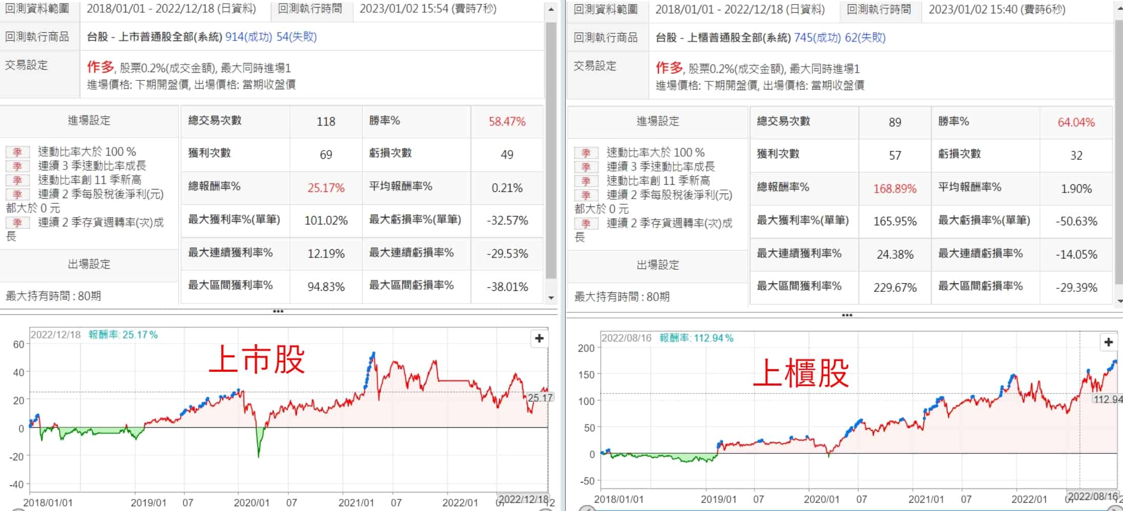 將上市櫃股票分開回測,可以很明顯看出,上櫃股的報酬率曲線一路爬升,且總報酬率把上市股高了許多,且勝率也提高到64.04%