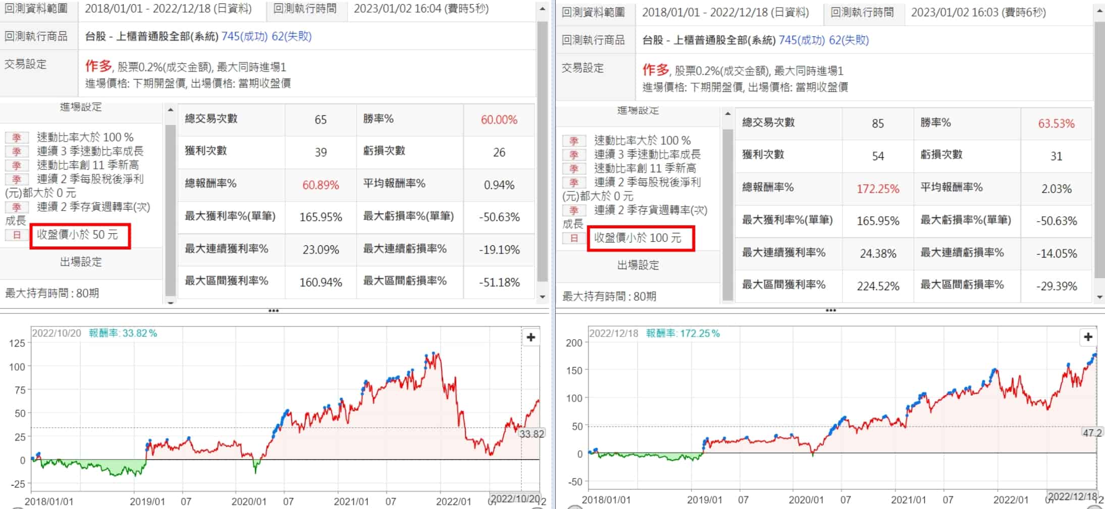 採用上櫃股,並且限制價格做回測,收盤價<100的時候,跟回測3的上櫃股的結果差不多,但以下就限制價格100來做回測