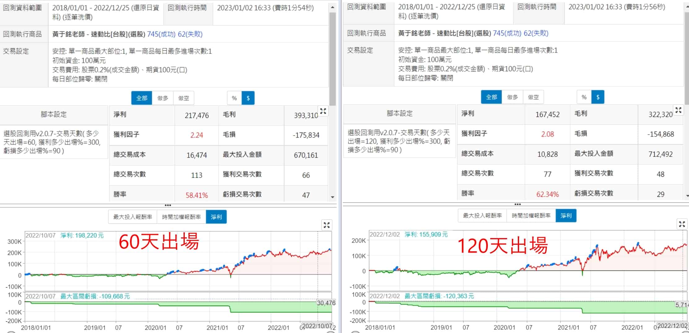 將持有期調整為60天跟120天來做回測比較,當持有期縮短為60天,勝率雖降為57.02%,但總報酬卻是增加的,下面採用交易來回測看看實際的獲利金額