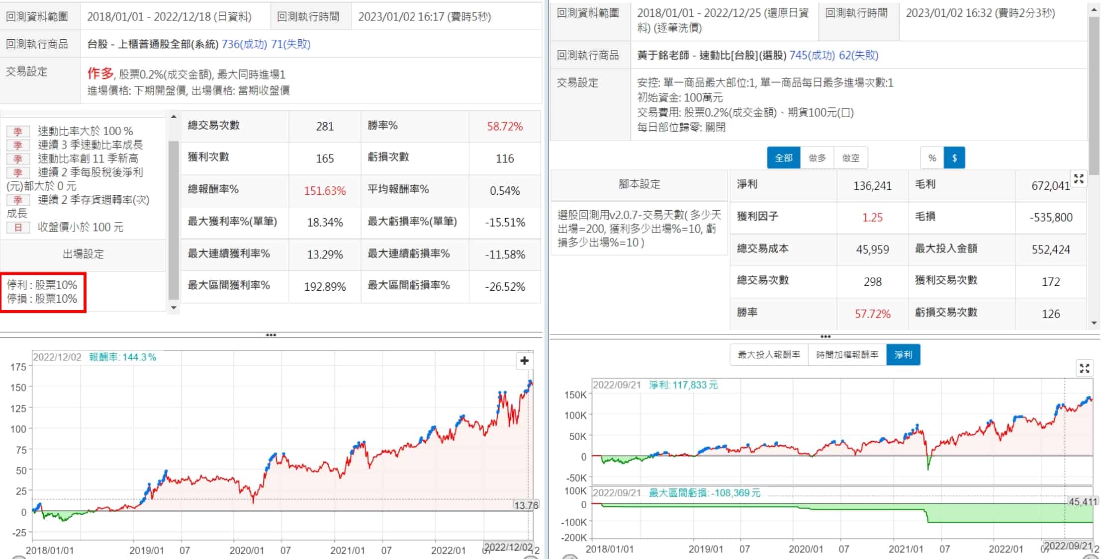 用回測5的條件,把停損利改為10%,左邊為選股回測,右邊為交易回測,感覺上回測的結果比上面好多了,至少淨利是一路往上的,尤其是2022年,幾乎都有持續再創高,