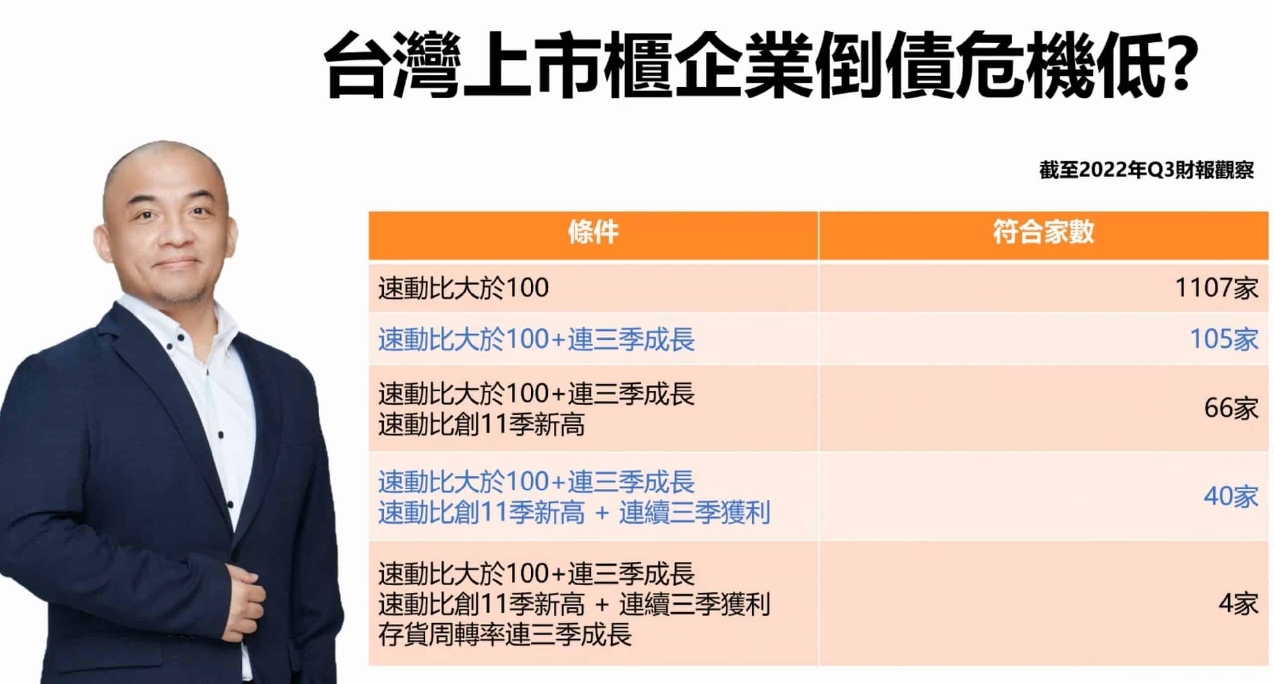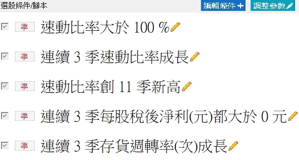 黃老師的選股條件如下,比較值得注意的是,老師的很多條件都比較偏向臨界值,不會去設定一個特定值做判斷,比如說,選用連續三季速動比率成長,而不會是採用選用連續三季速動比率成長X%,主要的原因在於,這些特定數值難以解釋怎樣算好怎樣算不好,且每個股票適合的數值又可能不同,所以老師會才用臨界值,像是稅後淨利>0,營收持續成長等等
