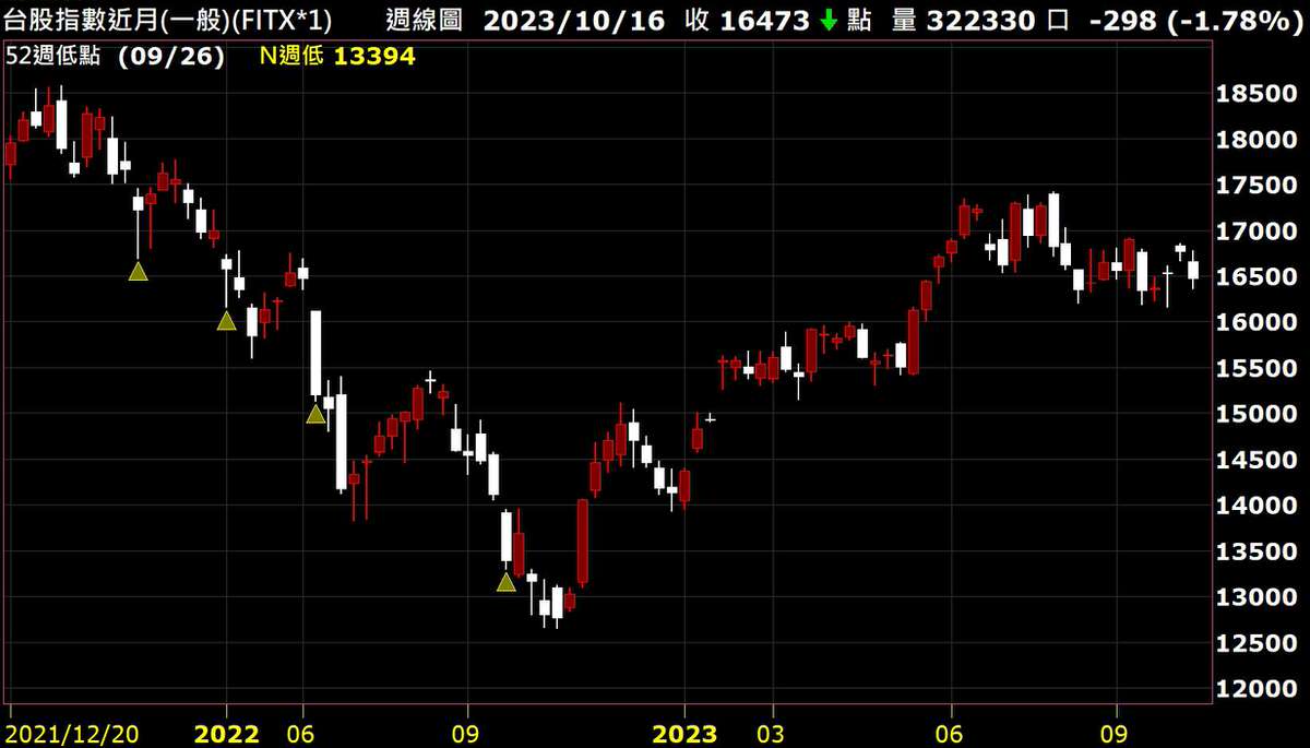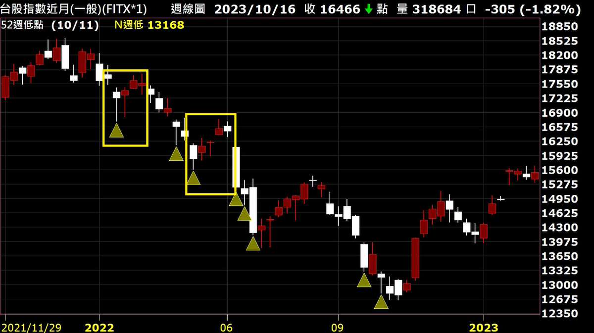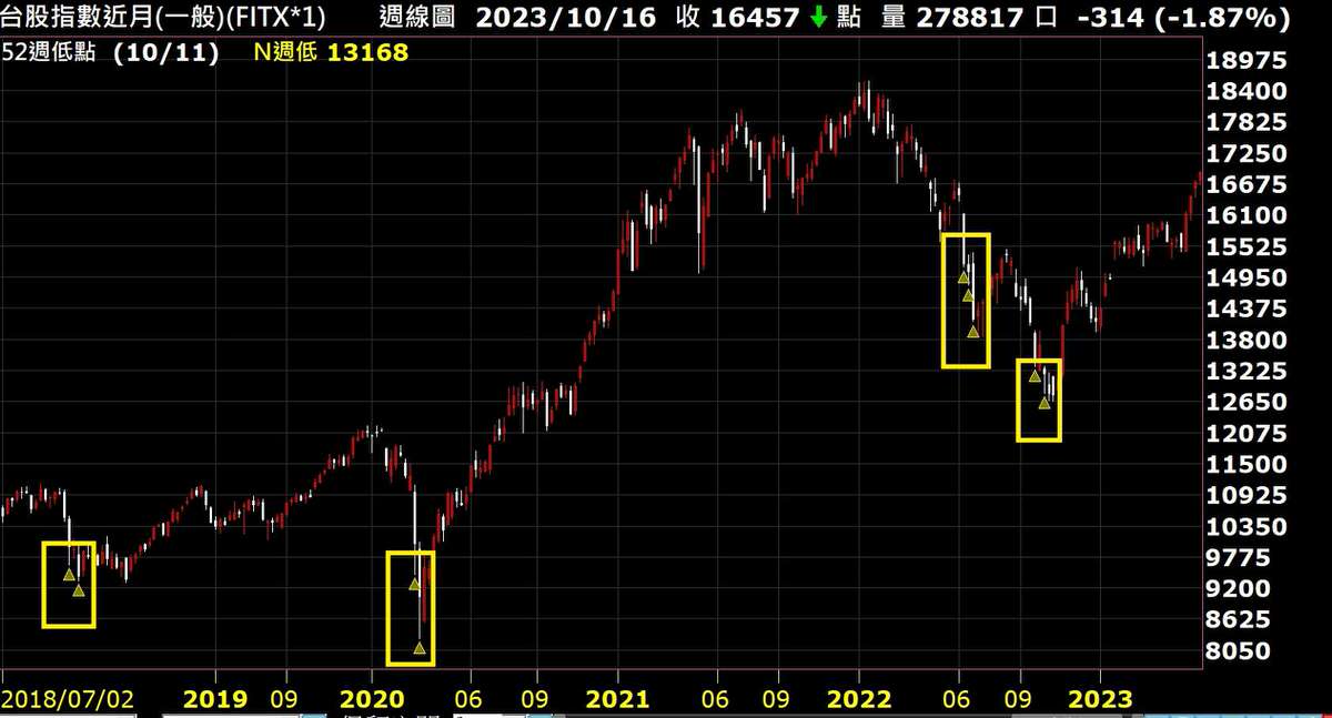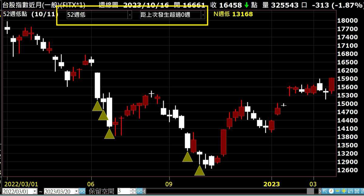 台指遇到52週低點會反轉嗎? 從下圖可以來做個觀察,似乎多是出現在相對低點的地方,但是出現52週低點後,常常不是馬上反轉,甚至還會連續幾週持續出現52週低